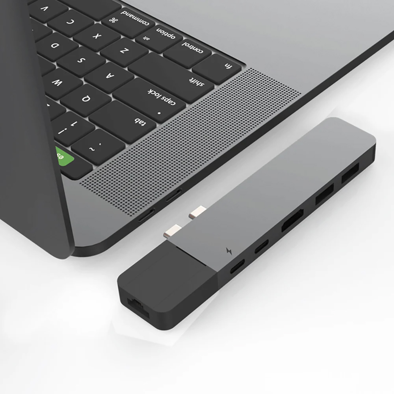 Enhance your connectivity with the HyperDrive NET GN28N-SILVER 6-in-2 USB-C Hub. Enjoy fast and reliable Gigabit Ethernet for seamless internet connections, along with crystal-clear 4K 30Hz HDR video output on HDMI displays. With high-speed USB-C capabilities, experience lightning-fast data transfer at 40Gbps and power delivery up to 100W. The hub features dual USB-C ports supporting power delivery and data, along with two USB-A 3.0 ports for additional connectivity. Its sleek aluminum enclosure perfectly matches your Apple device. Elevate your connectivity with the HyperDrive NET 6-in-2 USB-C Hub.