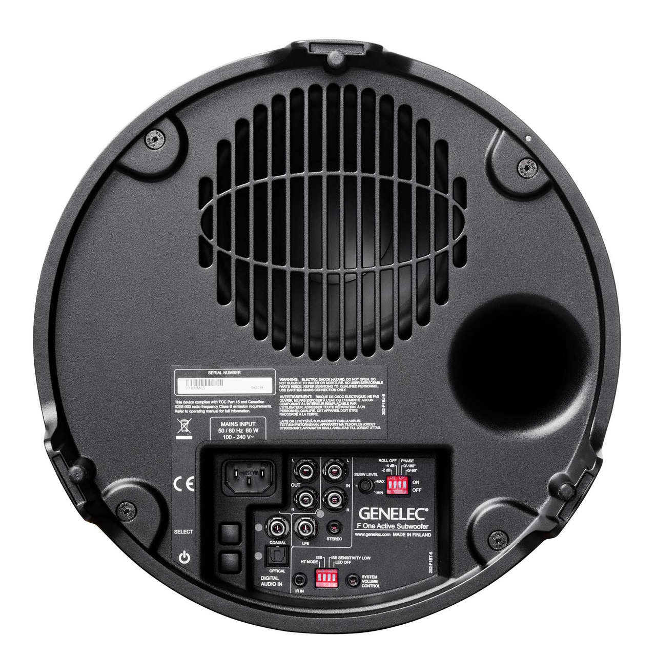 The Genelec F1BMM F One is a compact, active subwoofer designed to complement Genelec G One or G Two active loudspeakers. The F One extends the system's bass response down to 35Hz and integrates perfectly with the main loudspeakers in any environment. The playback level for the entire system is conveniently controlled by the wireless volume control provided with the subwoofer. A wired volume control is available as an option. The F One has integrated bass management for the two output channels which directs frequencies below 85Hz to the subwoofer and higher frequencies through the output connectors to the main loudspeakers. When using the subwoofer for the .1/LFE channel of a multichannel system, it is recommended that bass management is done in the processor or receiver and only the LFE channel is connected to the subwoofer.