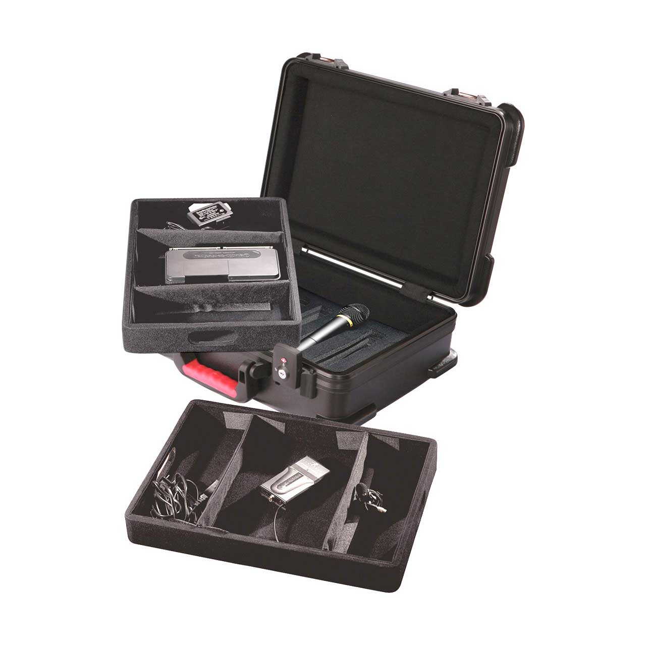 Gator GTSA-MICW7 TSA ATA Case for (7) Wireless Mics & Accessories. TSA Series ATA Molded Polyethylene Case for (7) Wireless Microphones with (2) Lift Out Trays for Recievers, Beltpacks and Accessories. Gator is the leading manufacturer of case solutions for the music and pro audio industries. They offer everything from covers, bags, lightweight cases, plastic cases, roto molded cases and ATA and Tour cases for guitars, amps, keyboards, band, percussion, microphone, racks, mixers, speakers, LCD/Plasma screens, utility, DJ, lighting, projector, laptop, digital recording and more.
