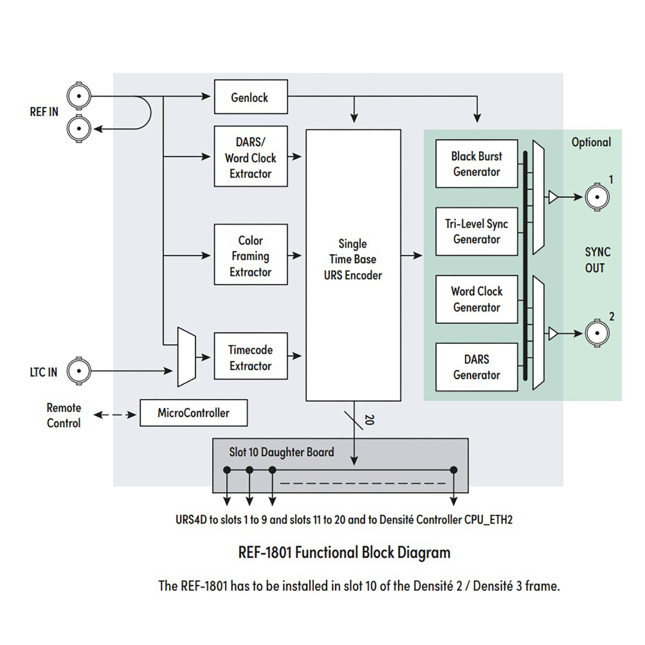 The REF-1801-SRP-3RU from Grass Valley is a rear module that pairs with the REF-1801-3RU card. It distributes a universal reference signal (URS) to all the cards within a Densite frame. It can also optionally generate two selectable reference signals for external use. The unique URS concept provides significant advantages as it generates a digital reference signal, and also simplifies interformat processing by using a unique reference signal for all video and audio frame rates. The REF-1801 has the ability to extract timecode from the input as per SMPTE-318M, whichallows for perfect audio/video phasing. Other features include the ability to slave Densit‚ frames, as well as advancing or delaying independently the two reference output signals.