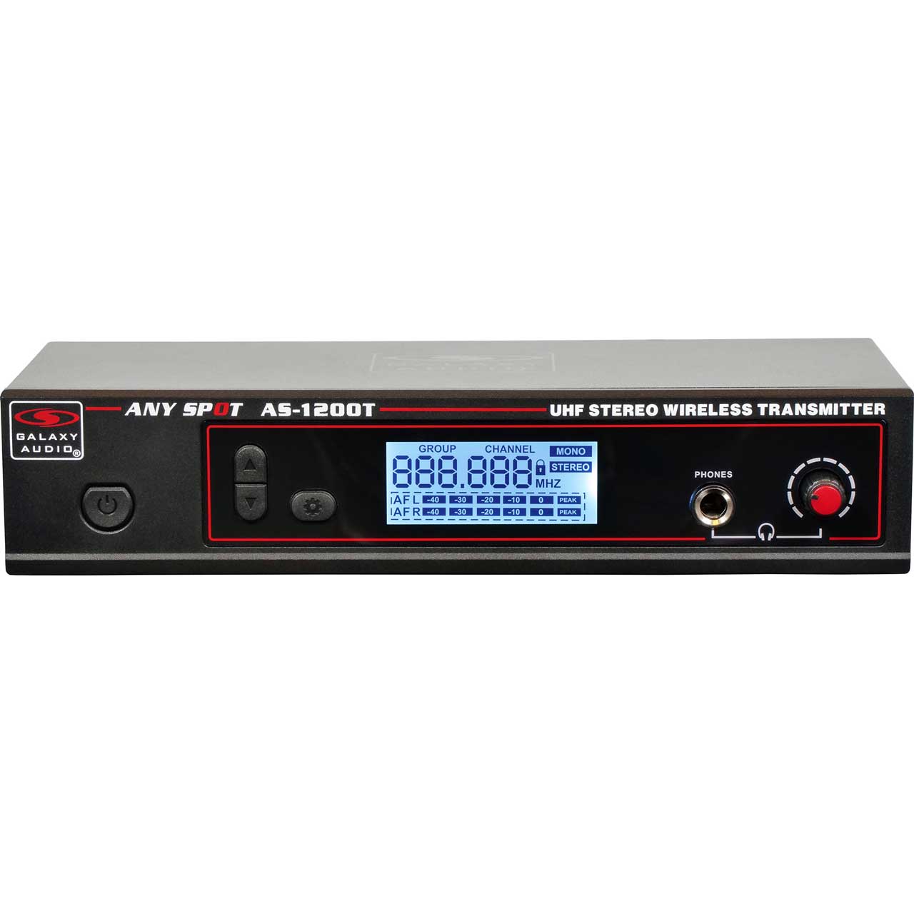 The AS-1200T transmitter incorporates a backlit LCD that displays lock on/off, L/R AF levels, group/channel, frequency number, and mono/stereo mode. AS-1200T front controls include a settings button, up/down select buttons, and volume control for the front facing headphone output. The back panel features line level right and left XLR/1/4" combo inputs and right/left AF level controls. A Single/Dual Rack mount kit and a BNC antenna is included.