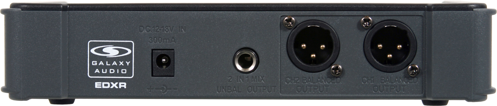 The EDX Series is a dual channel wireless system. The EDX features 2 internal antennas (1 for each receiver), 16 selectable channels on each receiver, and IR Sync from receiver to transmitter. The EDX has 2 discreet male XLR outputs and 1 combined 1/4" output on the back of the unit. The output is controlled by a volume control for each receiver, located on the front of the unit.