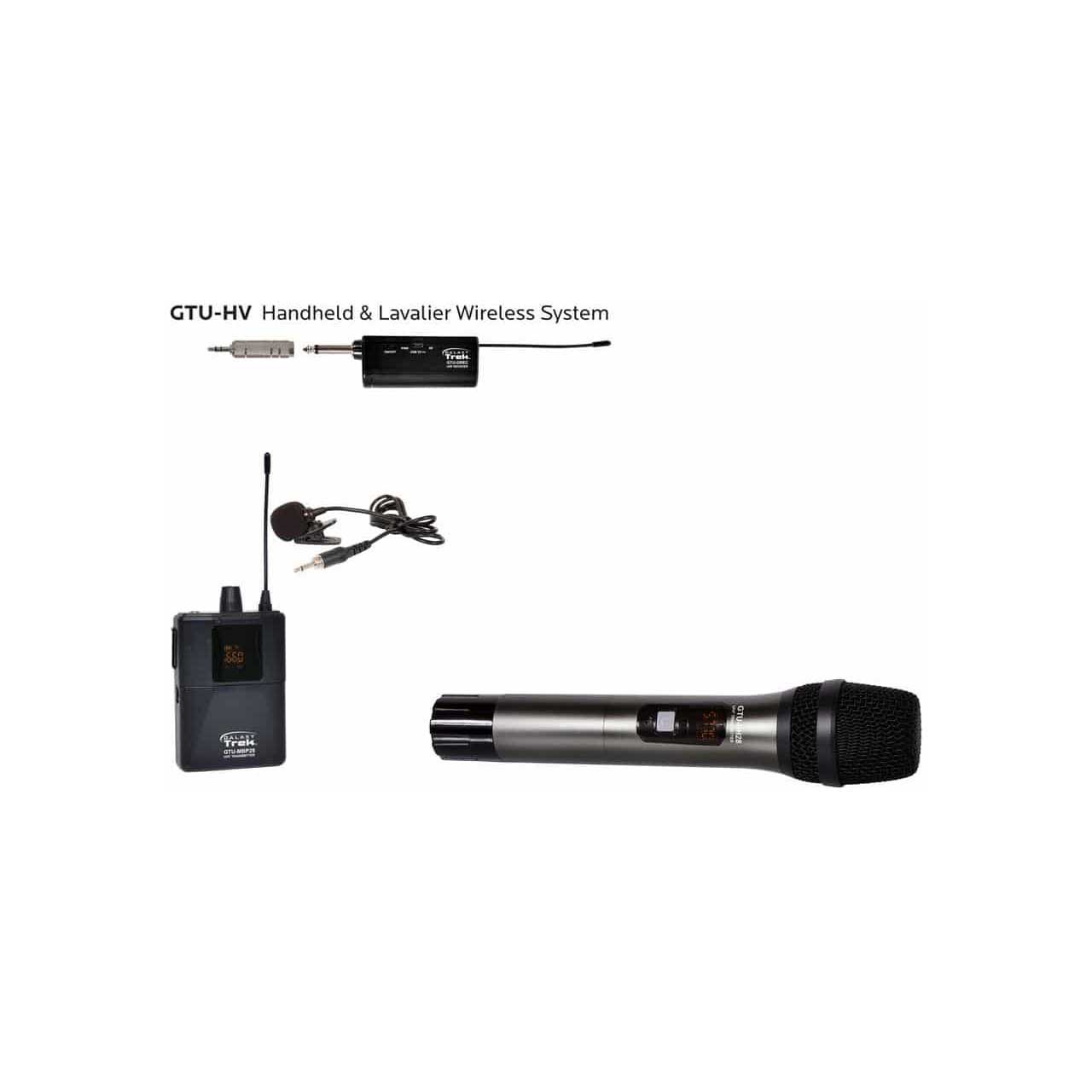 Galaxy GTU-HVP5AB UHF Mini dual wireless system includes 1 handheld transmitter, 1 lavalier mic w/transmitter, and 1 dual receiver.