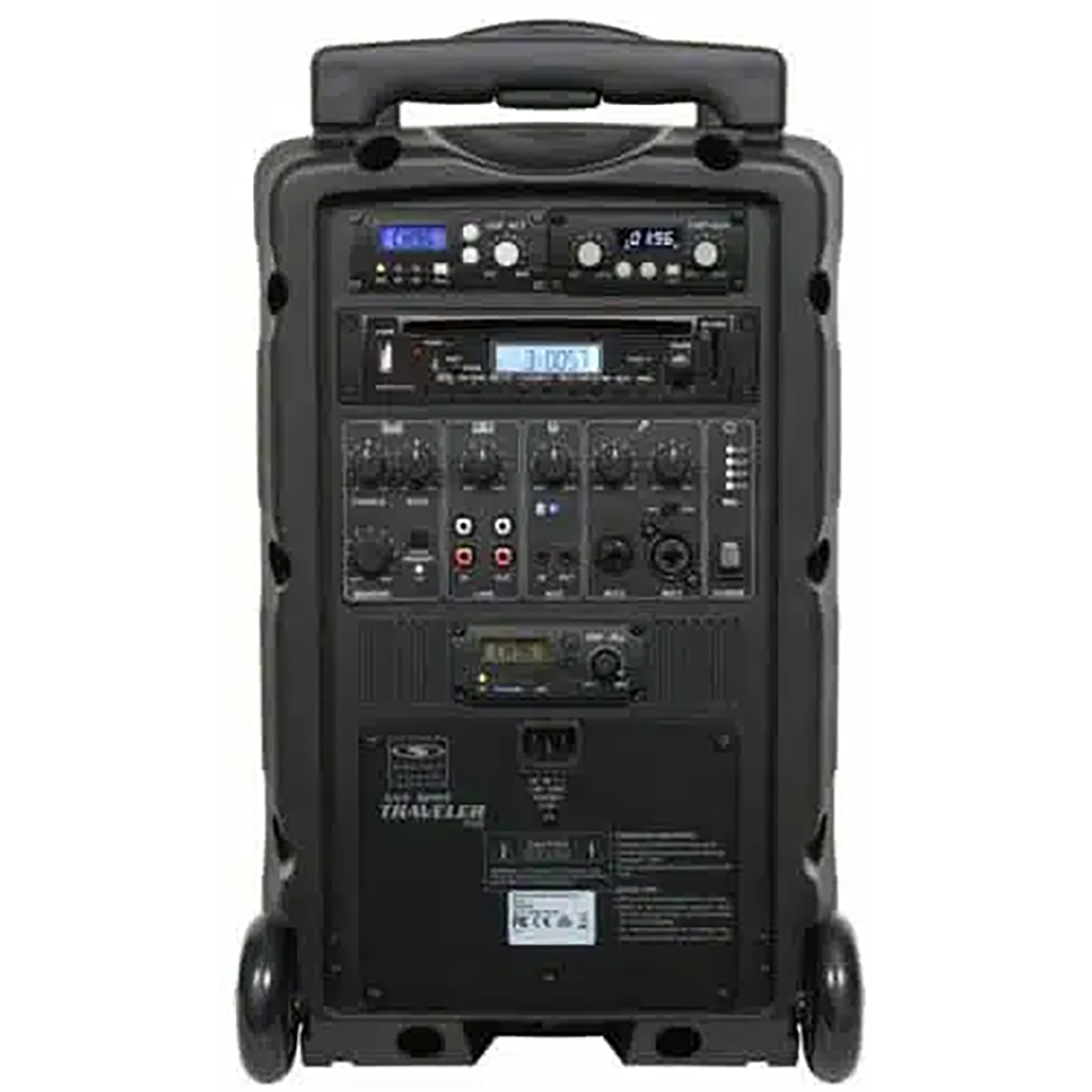 The Traveler speaker PA system has a unique "plug-in" modular design, which allows optional Function Modules to be easily added or removed. Optional Modules include Wireless Mic Receivers (with Handheld, Headset, & Lavalier options), a media player (CD/SD/MP3 or CD/DVD/SD/MP3 options), and an Audio Link Module, which wirelessly transmits the entire audio mix from one Traveler to any number of satellite Travelers. Since all the Modules are internally wired, no external patching is necessary.