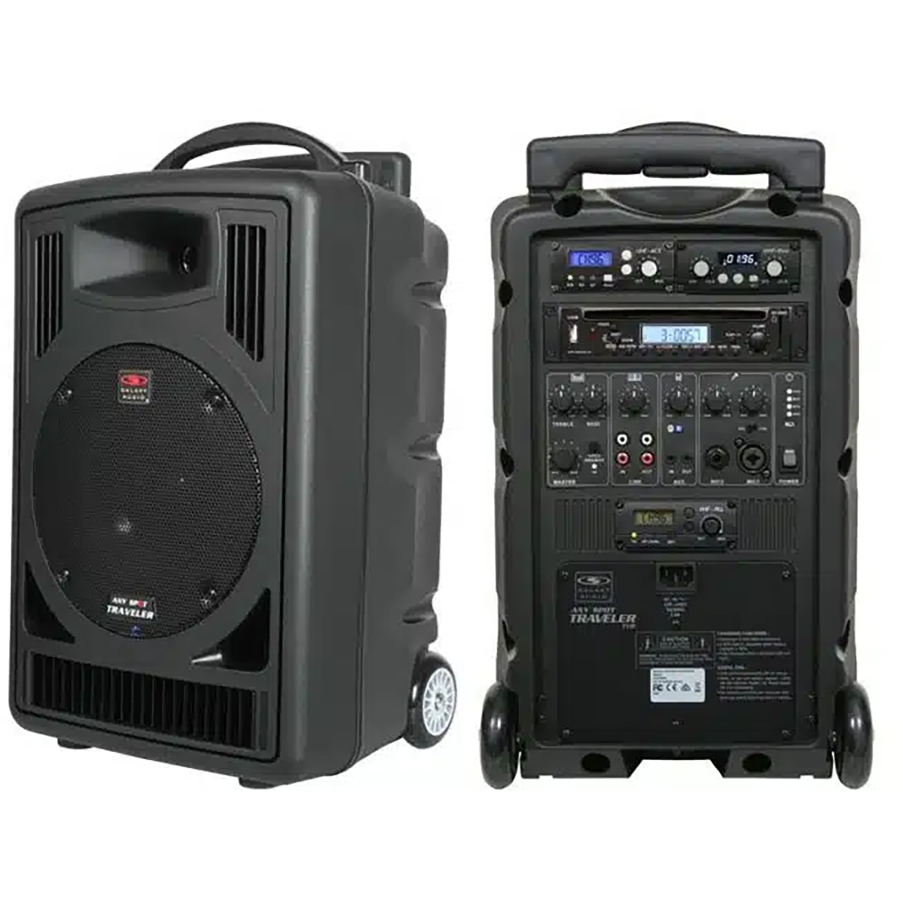 Designed smaller and lighter than the TV10, the Galaxy Audio TV8, the durable ABS enclosure still includes a convenient carry handle, retractable handle, wheels for easy transportation, and a provision for standard pole mounting with a locking mechanism. The Traveler is designed for people who need a portable, lightweight, "all in one" PA system that allows for a quick and uncomplicated setup.