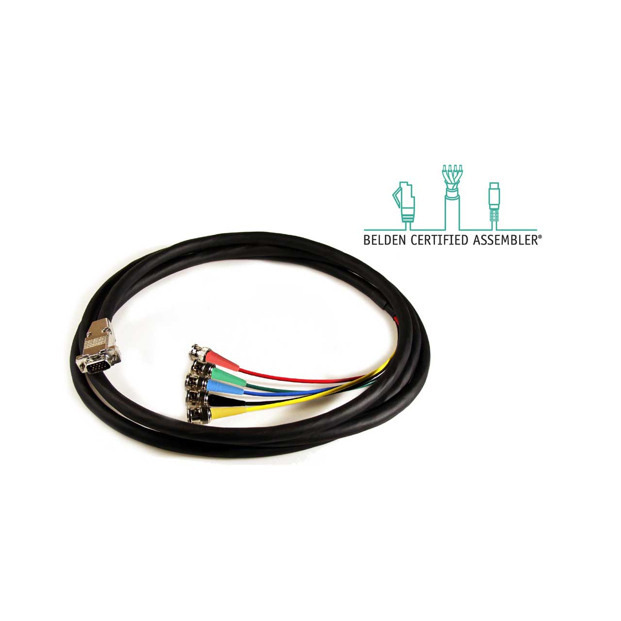 VGA male to 5-channel BNC breakout cables manufactured with superior Belden 1279R mini hi-res RGB video coax and Kings premium BNC connectors. Bundled in color coded channels, this cable helps keep your wiring harness neat and clean. Can be used with confidence for super hi-res CG workstation interconnects and digital video studio installations.