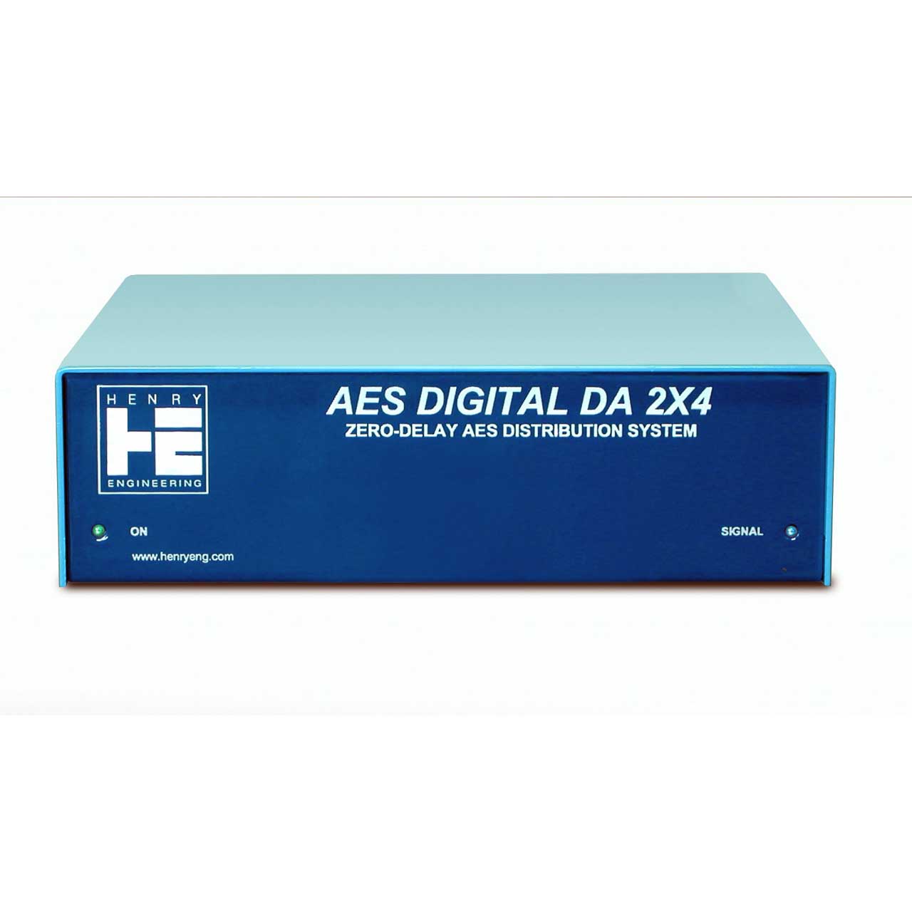 The Henry Engineering AES Digital DA 2X4 is a distribution system for digital audio signals. It can accept either an AES or S/PDIF digital audio stream, and create four identical AES outputs. The AES DA is 100% bit-accurate and transparent to the source, adding absolutely no delay or latency to the signal. The AES input and all four AES outputs are individually transformer balanced and isolated from ground. The S/PDIF input signal is converted to an AES standard level and source impedance. The AES I/O is via XLR connectors; Pin 1 is connected to the AC "safety" ground. The S/PDIF input is via an RCA connector; the shield is isolated from the AC ground. No user adjustments or calibration is necessary. A blue "Signal" LED confirms the presence of an input signal.