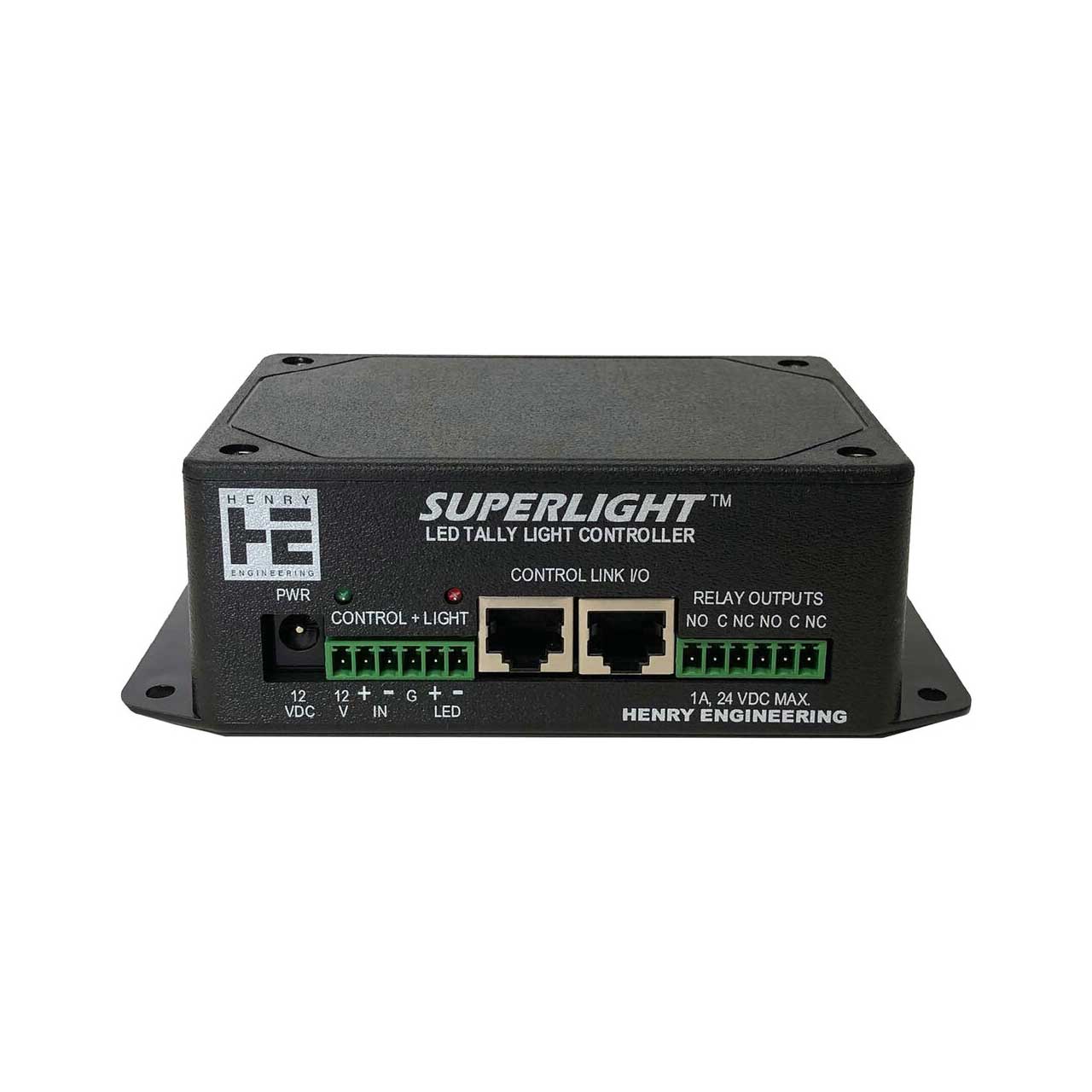 The Henry Engineering Superlight is a logic/control interface for controlling low voltage studio tally lights. It can directly power 12 volt DC LED tally lights that draw up to 500 mA. SuperLight includes a flasher circuit, as well as a DPDT relay output that can be used for any low voltage switching, speaker muting, or other utility use.