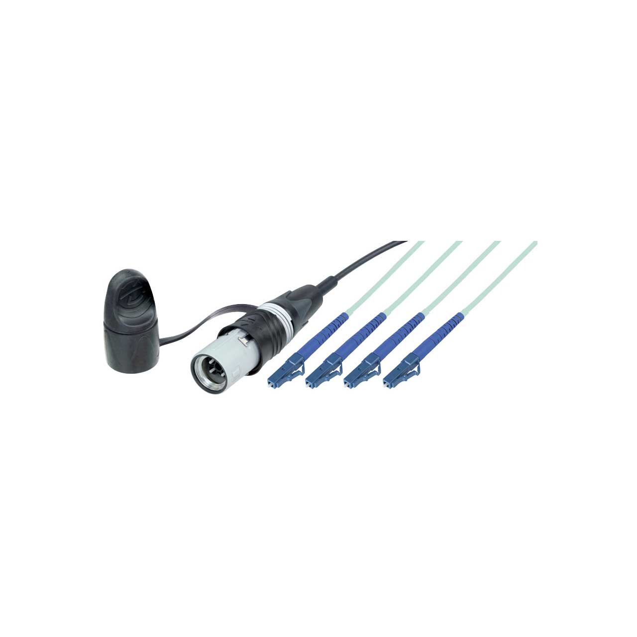 Neutrik opticalCON QUAD LITE Multimode to Quad (4) LC fiber breakout cables by Camplex provide a semi-rugged alternative to opticalCON Advanced systems when the action calls for a compact, lightweight solution. The cable is designed to allow higher bend radius performance typically used in rack interconnects, camera cranes, steadicam rigs, truck bays and other similarly controlled environments. Best of all, It is fully compatible with standard opticalCON QUAD connections. The QUAD delivers a ruggedized 4-channel fiber optic connection system for semi and permanent installation. Mated connections are waterproof acc. to IP65 safety standards and the reliable push-pull locking mechanism assures there is never an accidental disconnect. All connections are compatible with standard opticalCON QUAD NO4FDW-A chassis connectors. LC Breakout ends are ideal for mating to truck, OB van and studio patch bays or for connection to IP networks and video extenders. LC ends can also mate with Neutrik brand opticalCON chassis connections.