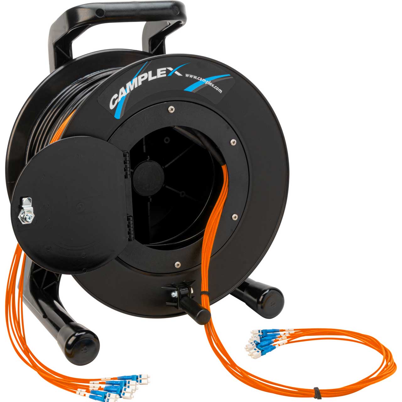 Reels can include a hinged latching door, outboard coiling ring with retention strap, or slotted disk dividers depending on cable diameters and lengths. Check with your sales associate for reel information regarding specific assemblies.
