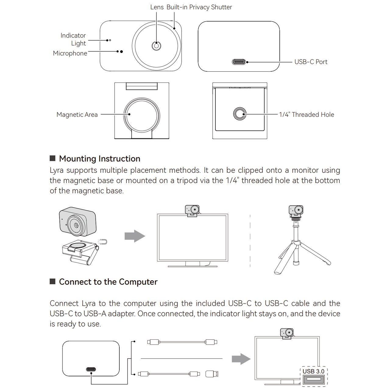 The Lyra webcam adopts the latest LARK A1 wireless microphone solution. Thus, the built-in microphone in the webcam boasts a powerful 48kHz/24-bit audio recording ability. Great for meetings and live streaming because the recording audio will sound really natural, just like the mic is close to the speaker's mouth.