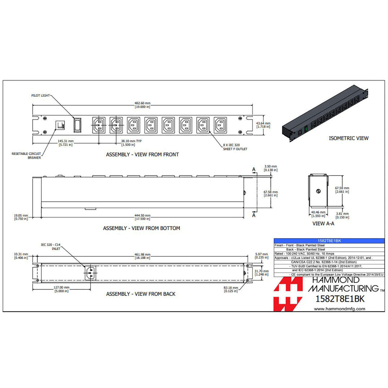 The Hammond 1582E Series are 1U, 19-inch horizontal rack-mount basic PDUs designed for efficient power distribution using IEC outlets (typically 8x C13) with a 10 amp - 100-240v rating. Featuring a robust all-steel housing with a black powder coat, it includes a 10 amp circuit breaker, an on-off rocker switch (often with a green light), and is designed for front or rear installation.