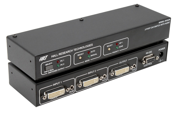 The Hall Technologies DVS-2A is a versatile and compact 2 input x 1 output DVI & audio switch. It supports PC resolutions to 1920x1200 or HD resolutions to 1080p. The unit allows one monitor to be switched between two video and audio sources. Input #1 has local loop-thru outputs of audio and video that is perfect for desktop PCs. The switched output can be selected via front panel push-button, through RS-232 serial port, or automatically by scanning and detecting active video on the inputs. In 'Auto' mode, the user can also assign priority to Input #1, whereby if both video inputs are active, input #1 would have precedence. The switched output can be blanked (with audio muted) or unblanked via the front panel or through the serial port. Optional rack mount brackets are also available.