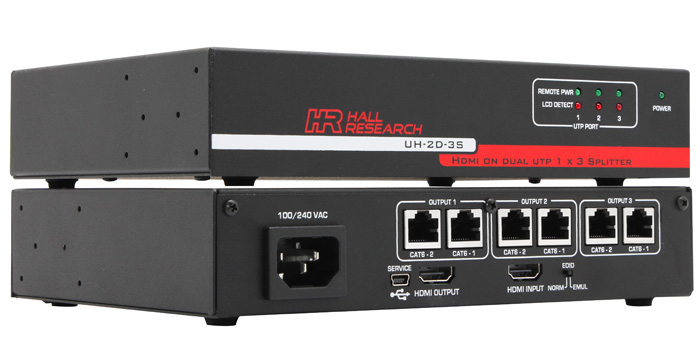 Hall Research's Model UH2D-3S is a member of the Mini-CAT video extension and distribution product line. The UH2D-3S is used to extend HDMI or DVI video up to 170 ft @ 1080i/720p or 130 ft @ 1080p resolution on 2 Cat6 cables to 3 remote receivers (Model UH2D-R). The unit provides one local HDMI output and 3 sets of RJ45 pairs for connection to the remote receivers. Cables that are of lower quality and construction will reduce the maximum distance.