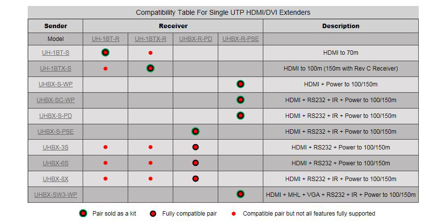 Hall Technologies UHBX-R-PD receiver module when paired with compatible sender ( Hall Research model UHBX-S-PSE or others ), can extend HDMI, bi-directional IR, full-duplex RS232, and PoH (power over HDBaseT) over distances of up to 150 meters (500 feet) using a single Cat6 cable. The pair can extend HDMI or single-link DVI video of virtually any resolution, to a maximum distance of 500 ft (150 m). Moreover, these extenders complies with Power-over-HDBaseT or PoH, hence only one end requires a power supply . The end identified as PSE (power sourcing equipment) injects power on to the Cat6 cable and the side identified as PD (powered device) is powered through the Cat6 cable. The PSE side requires connection of an AC adapter that supplies 5v DC, while the PD or WP(wall plate) side is simply powered through the RJ45 connector from the opposite side.