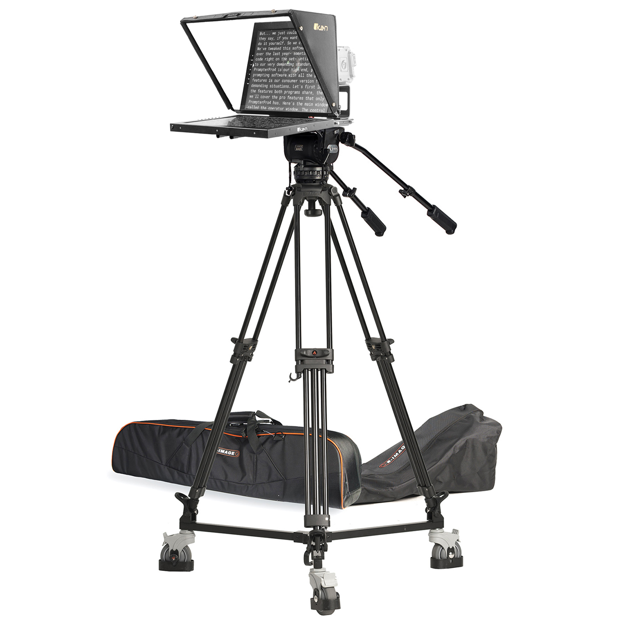 Ikan's PT4900-V2 Turnkey Broadcast Solutions include everything you need for your professional camera setup. This solution includes a 19" teleprompter, tripod, and dolly.