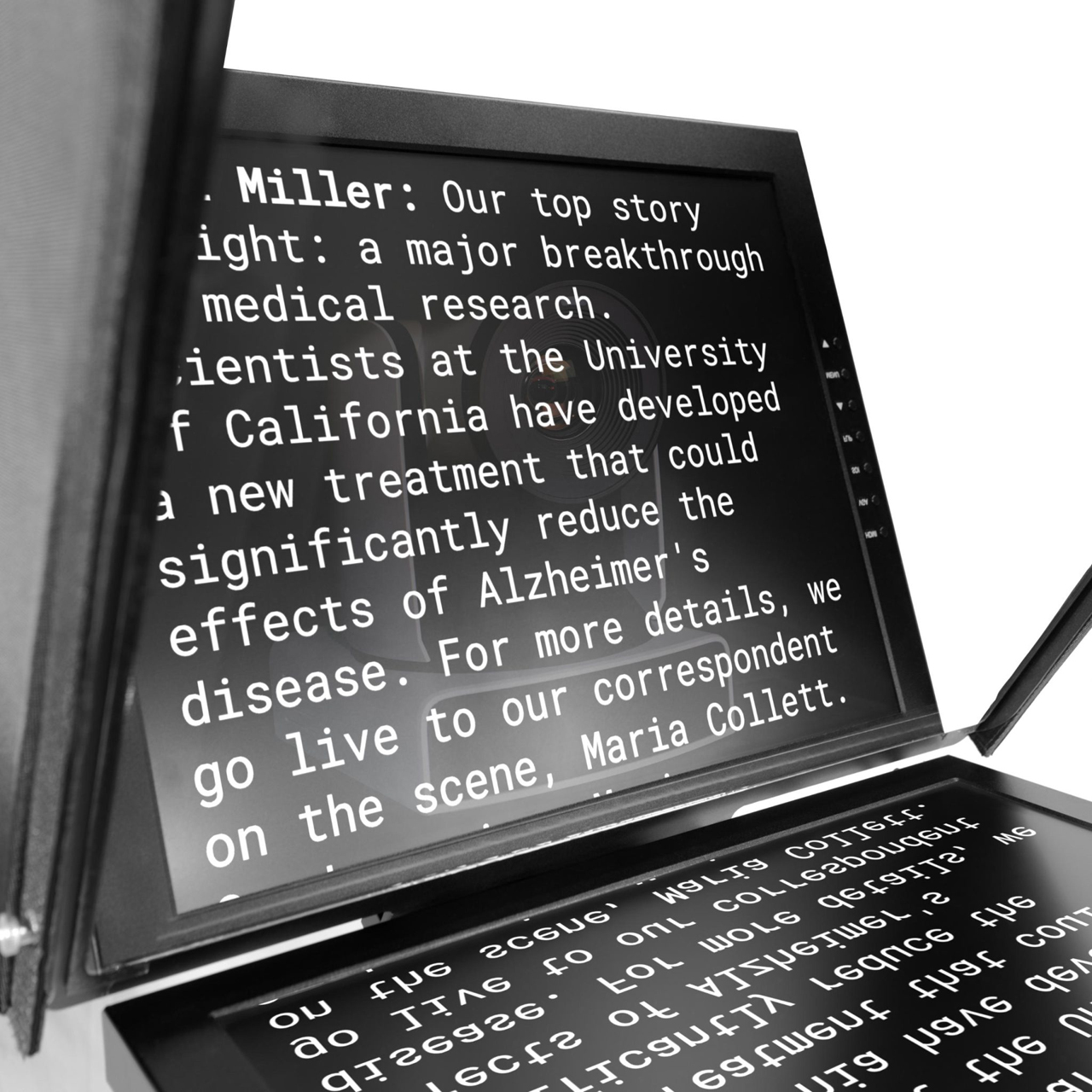 The glass is coated so that it reflects 65% of the light projected onto it while allowing the remaining 35% to pass through. This unique characteristic enables the presenter to read the reflected script text clearly, projected from a monitor below or behind the glass, while simultaneously allowing the camera positioned directly behind the glass to record through it without capturing the reflected text.