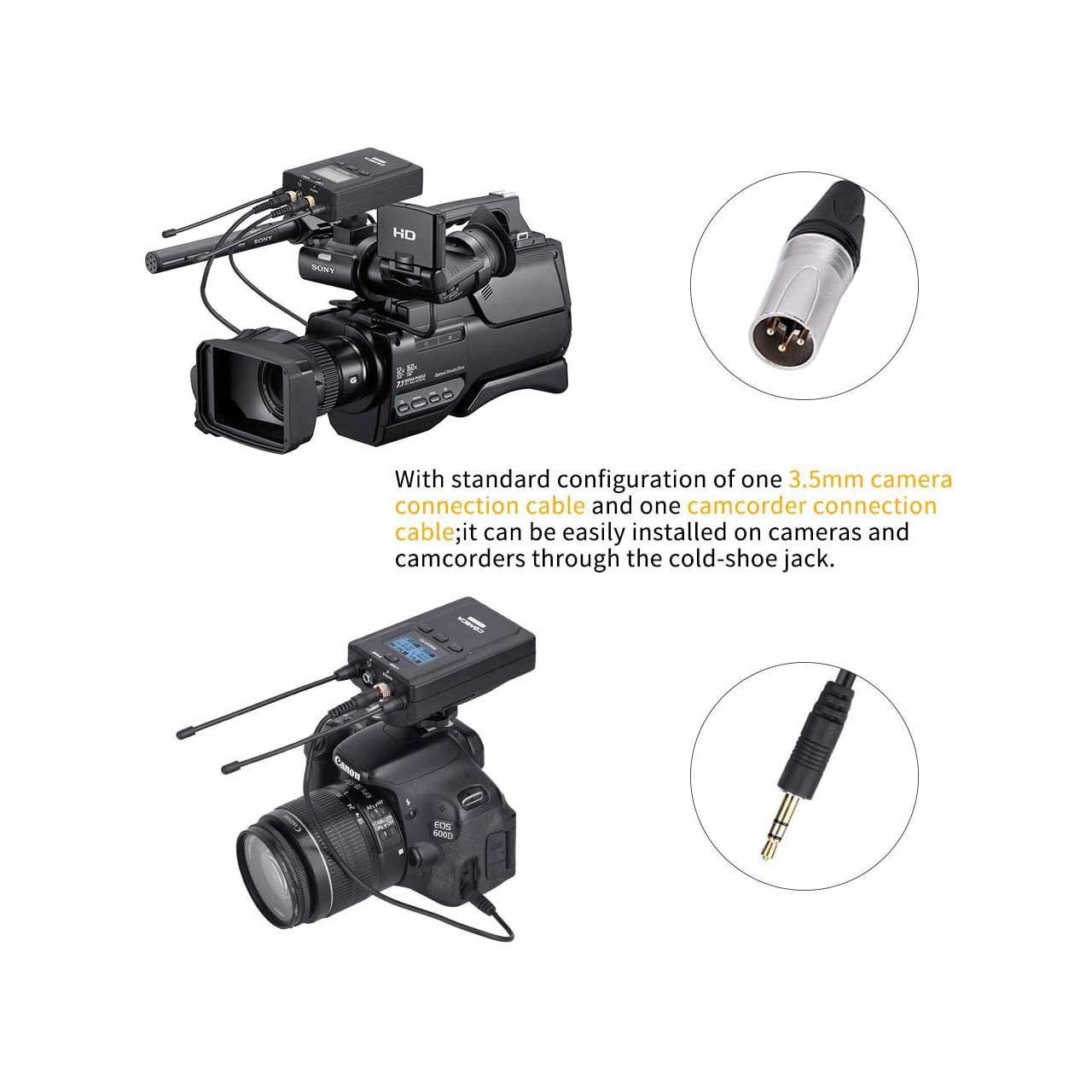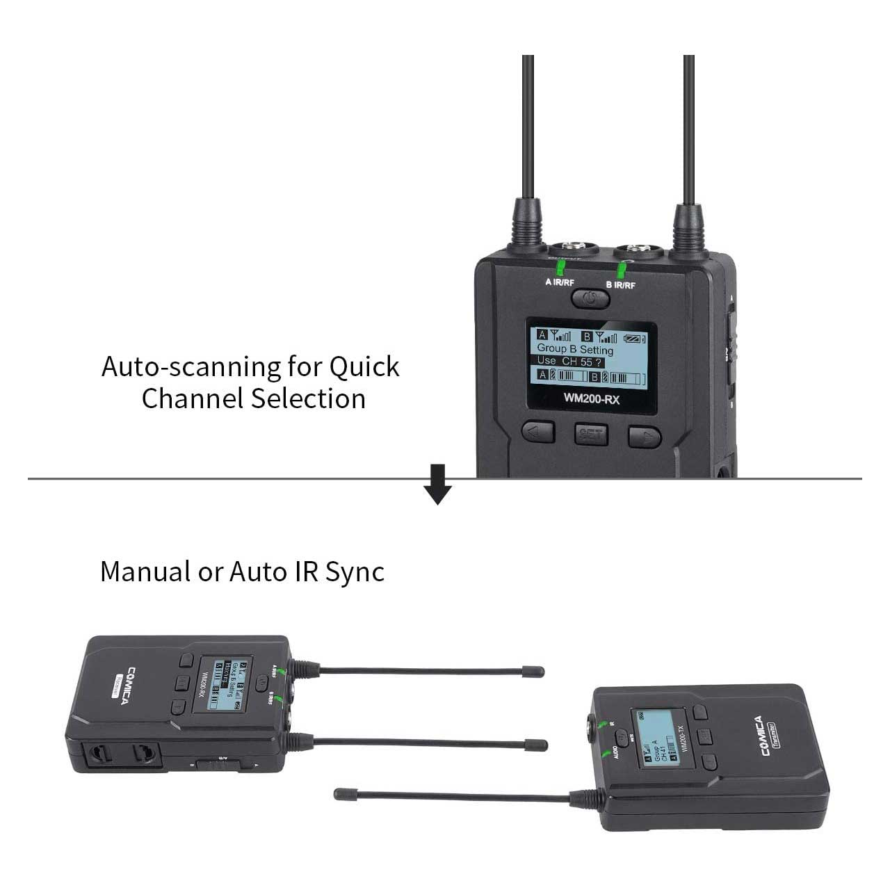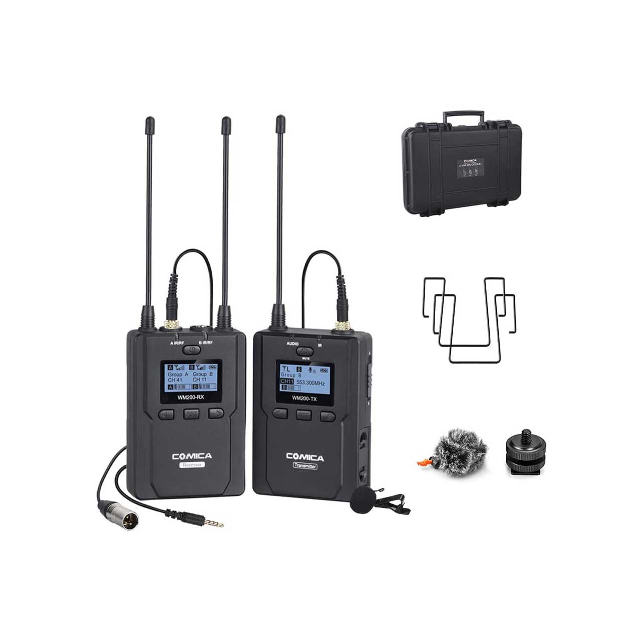 Comica CVM-WM200C is a wireless microphone with one transmitter triggered by one receiver, It utilizes UHF wireless technology and LCD lattice screen, 16-level adjustable volume, and is integrated into LCF, Auto IR Channel-match, M/S switch, RF signal strength adjustment, MIC/LINE IN input dual selection, Real-time Audio Monitor functions, etc. At the same time with strong shielding anti-noise performance.