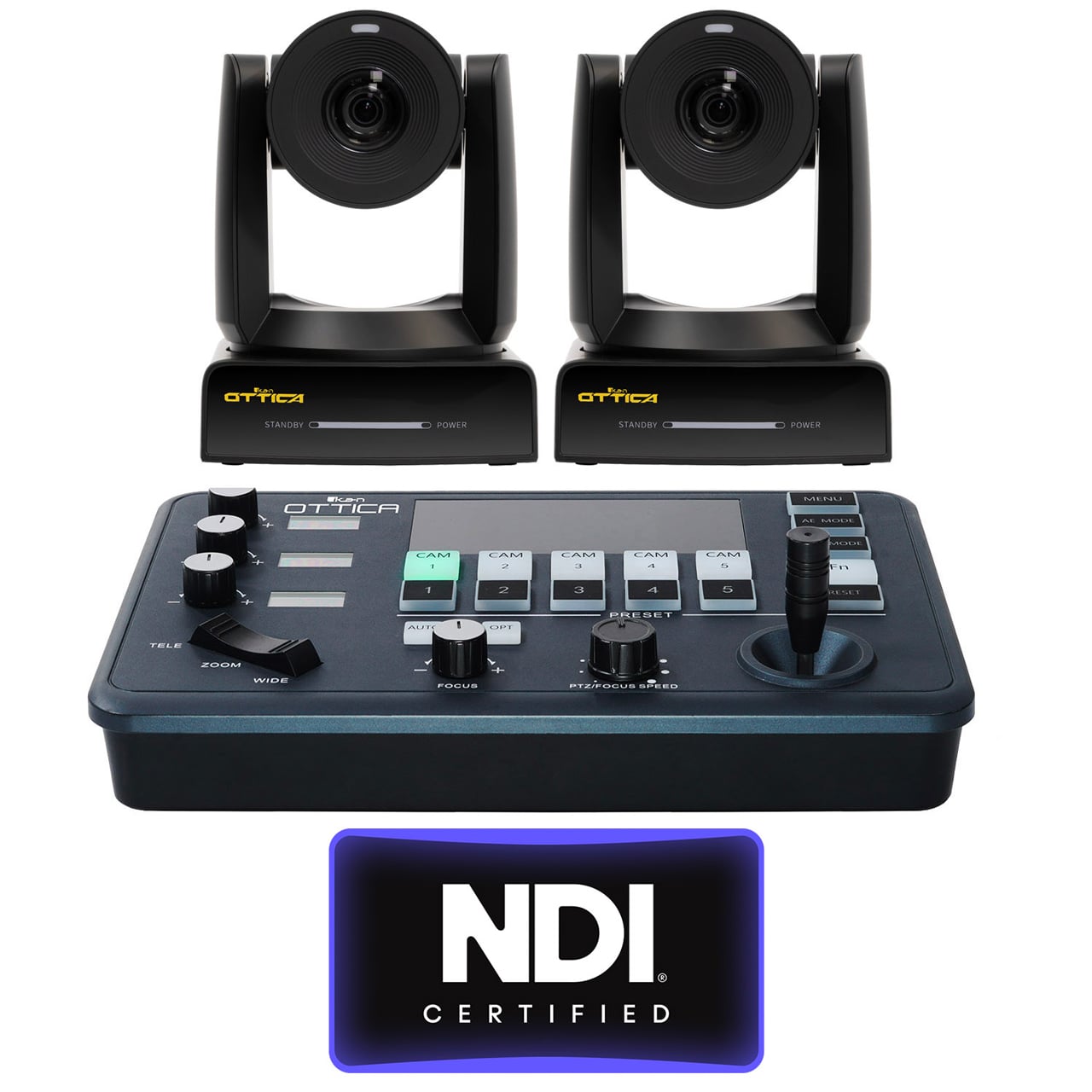 The Ikan OTTICA-4K3-2PTZ bundle includes 2x Full-HD NDI PTZ Cameras and 1x PTZ joystick controller.
