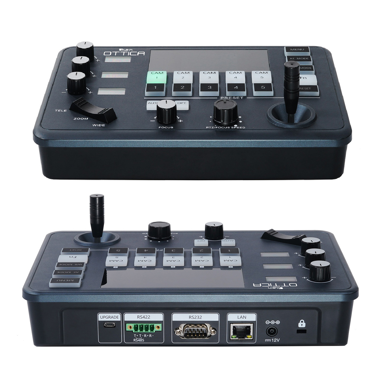 The OTT-CONTROLLER-V2 is a compact PTZ controller that effortlessly manages up to 10 cameras, supporting IP and analog protocols like IP VISCA, VISCA, and PELCO D/P, with the flexibility to use multiple protocols simultaneously. Its user-friendly design includes a large LED screen for network and menu navigation, paired with smaller LED screens and knobs for fine-tuning exposure and color settings such as focus, iris, and color temperature. Equipped with a 2-axis joystick and zoom rocker, it ensures precise pan, tilt, and zoom control, with a speed knob offering seven levels for customized PTZ and focus adjustments.
