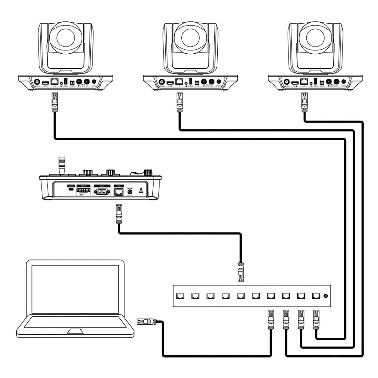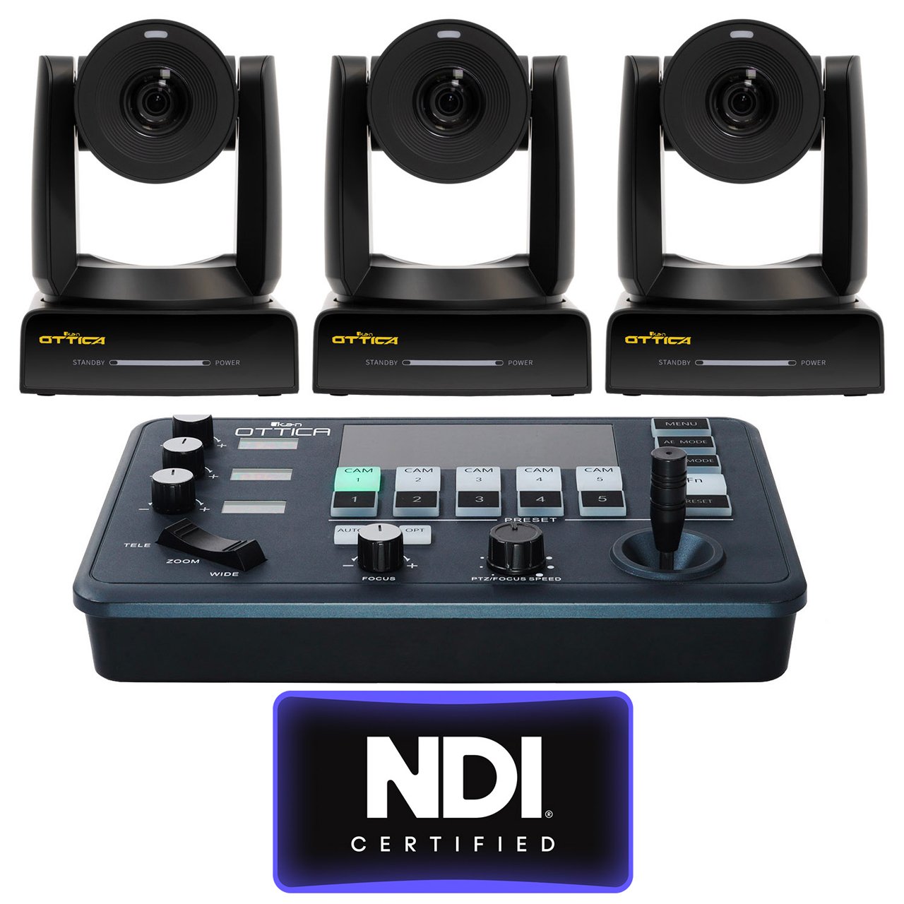 The Ikan OTTICA-4K3-3PTZ bundle includes 3x Full-HD NDI PTZ Cameras and 1x PTZ joystick controller.