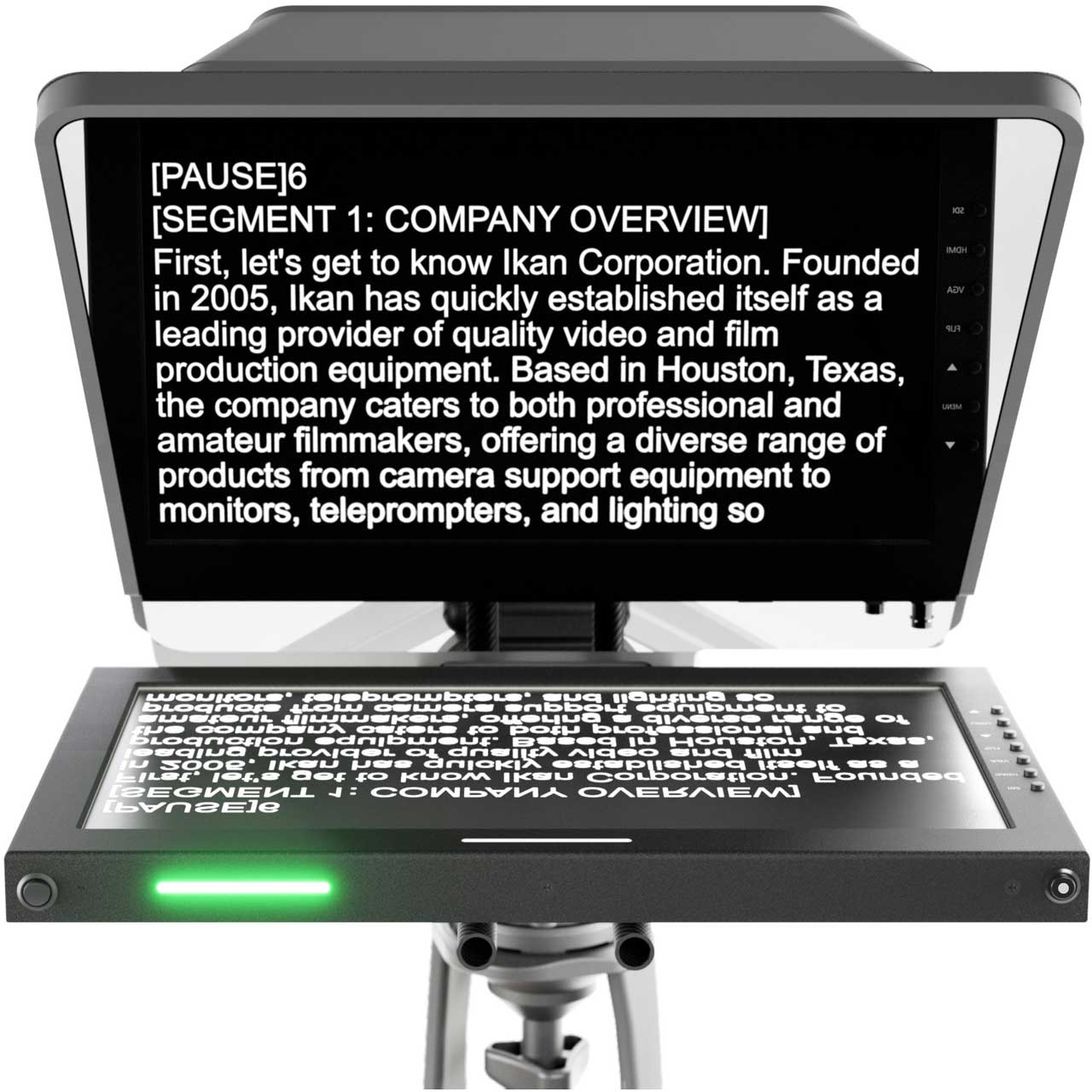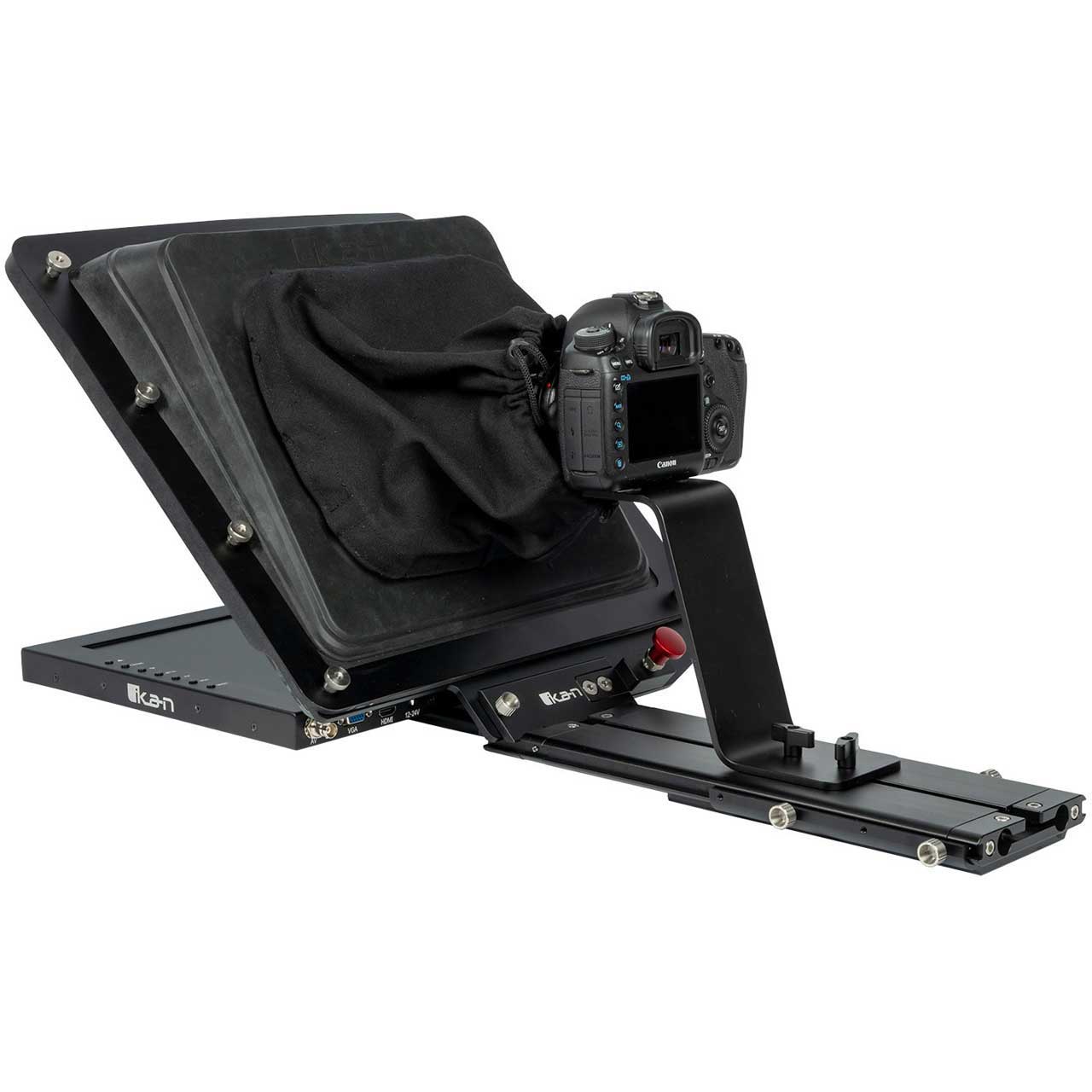 The Ikan PT4500W professional teleprompter is designed for a quick and easy setup to work efficiently in outside broadcast applications or professional studios. The teleprompter includes a 70/30 reflective glass that makes the reflection easier to see for the presenter. The lightweight aluminum widescreen teleprompter has multiple 3/8-16" and 1/4-20" for mounting to a tripod or pedestal. The monitor includes 3G-SDI, HDMI, and VGA inputs. Its high bright screen ensures clear visibility in any lighting condition. An intuitive image flip button allows for easy adjustment of the display orientation. This monitor also features a wide viewing angle, as well as integrated tally lights to let you know when your camera is live.