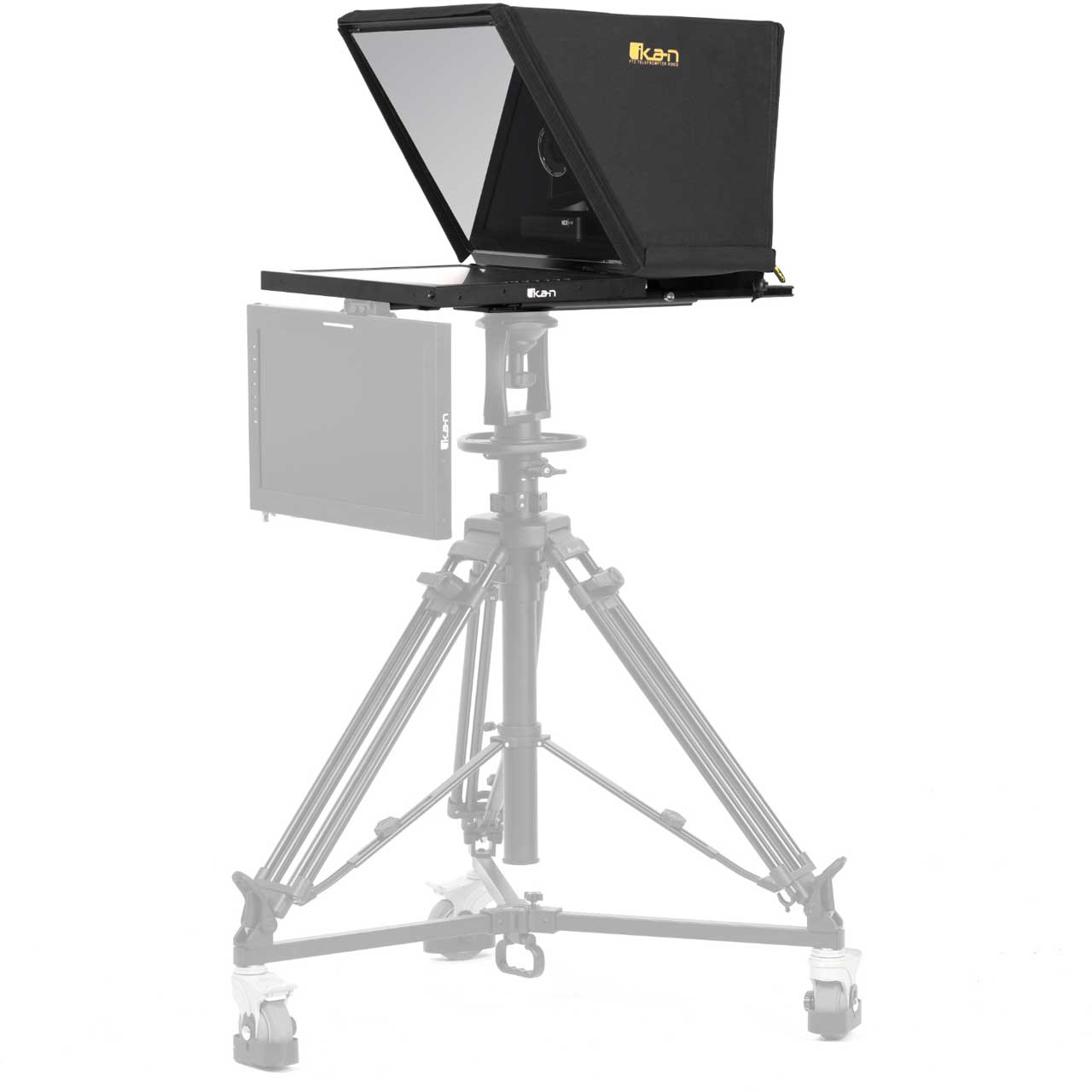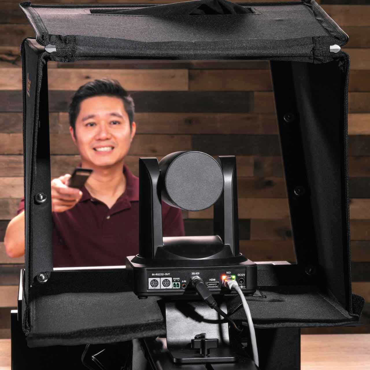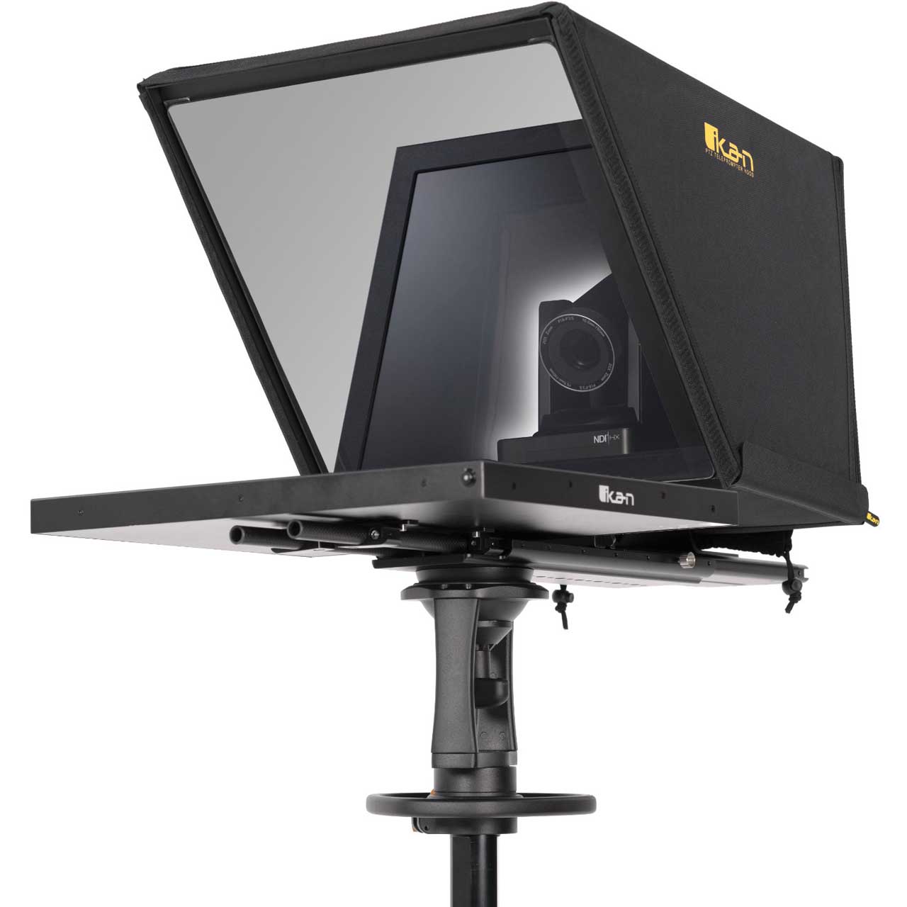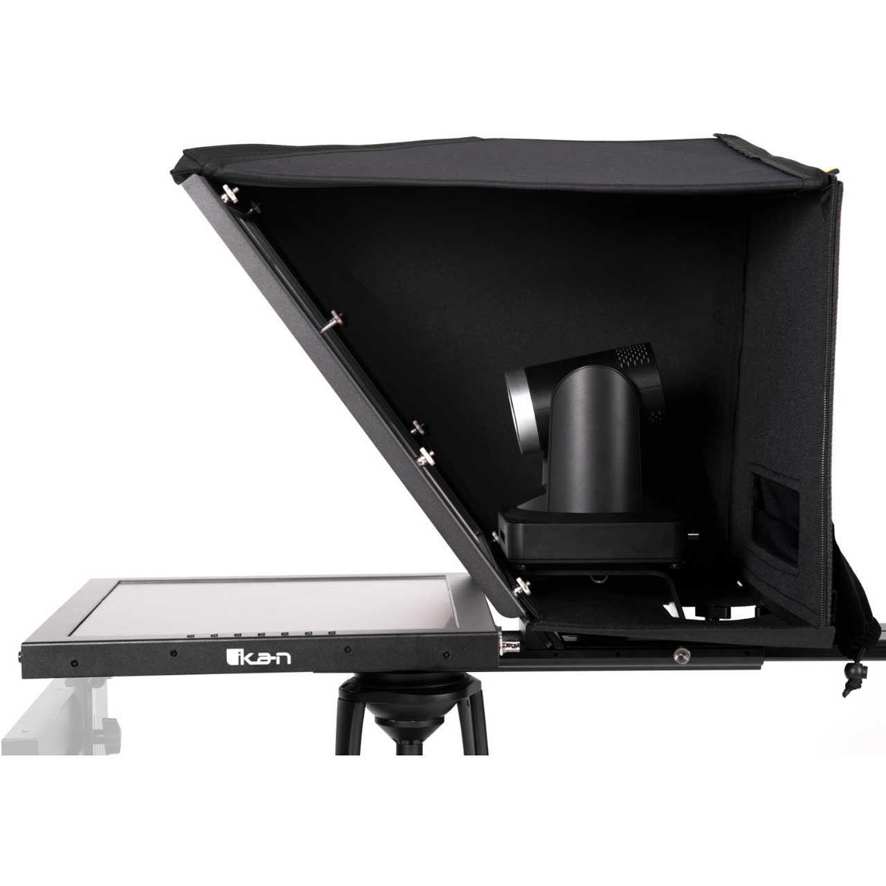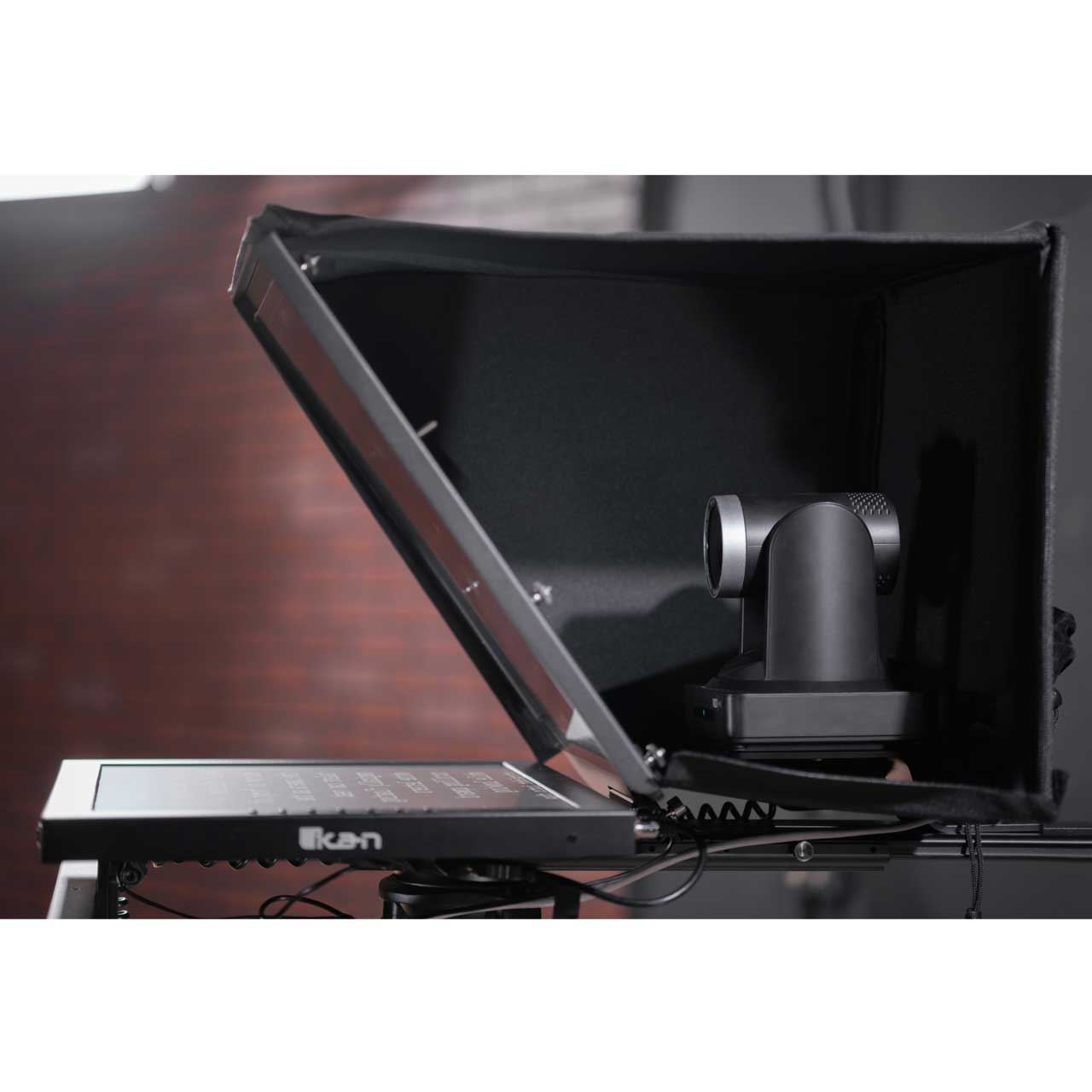 The ikan PT4900-PTZ-OTTICA 19" PTZ Teleprompter from Ikan is a professional solution for teleprompting with PTZ cameras. The package provides an extra-wide hood assembly to allow considerable movement of the camera within the wide beam splitter glass. The PTZ Teleprompter features a 19" 1000 cd/m² monitor, 70/30 20"-wide beamsplitter glass, and a 25' reading range. The teleprompter is designed for use with a wide range of PTZ cameras, as the wide beamsplitter provides for a wide amount of left-right panning. The teleprompter includes a base system that can be easily shifted forward and backwards, which enables mounting the camera to the prompter without requiring counterweights.