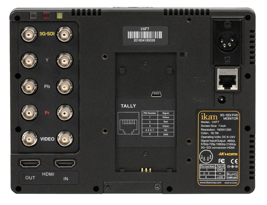 The VXF7 is a professional tool designed for the working professional. The ergonomics and button layout provides ease of use in the field. Four knobs on the front make it easy to adjust settings such as brightness, contrast and color. The back of the monitor is equipped with professional BNC connectors to keep your cables in place. A locking 4-pin XLR power input is also included so you never have to worry about losing power with a loose connection.