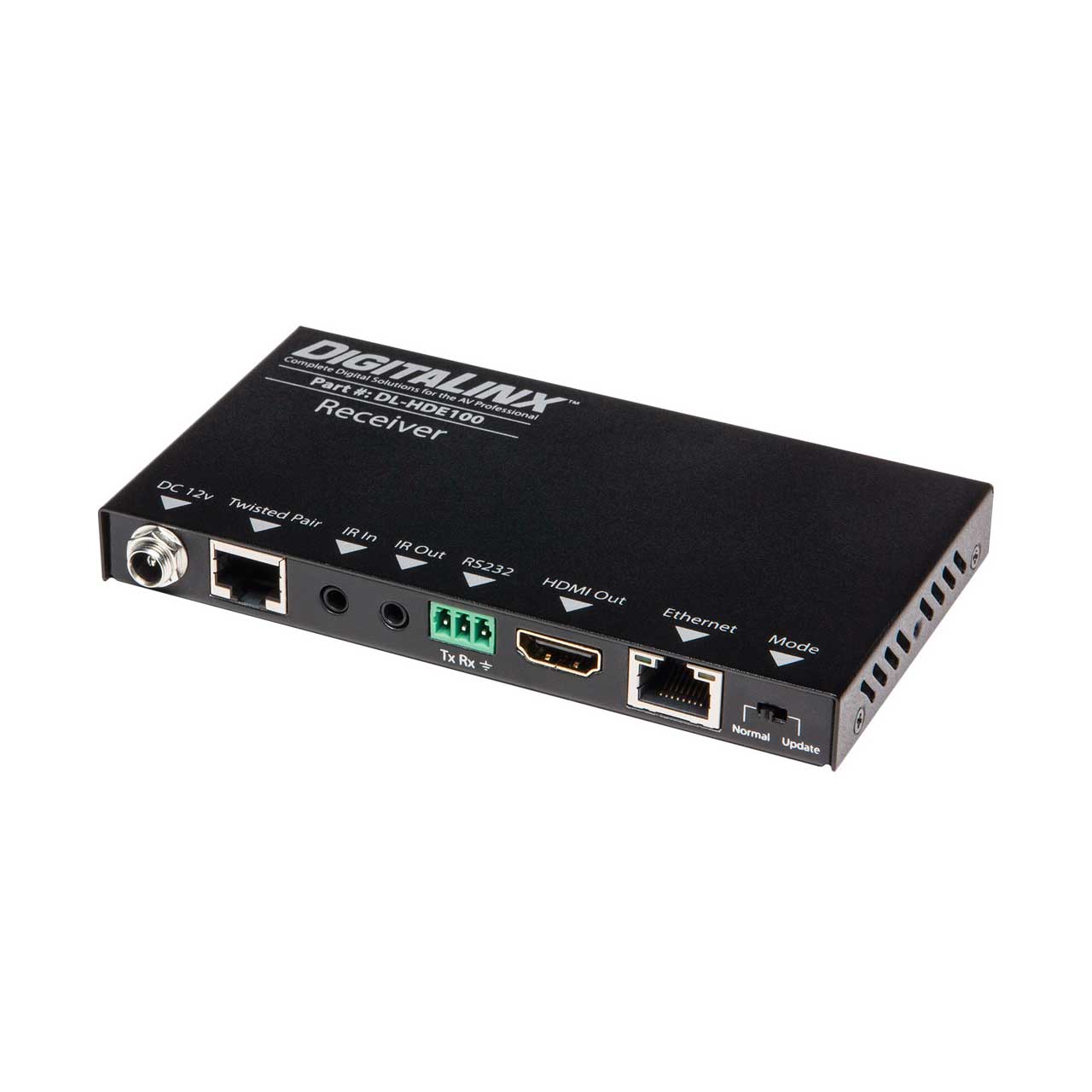 The DigitaLinx DL-HDE100 extender set transmits HDMI, Ethernet, bidirectional IR, and RS232 up to 100 meters away using a single twisted pair cable.