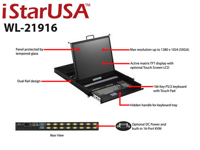 iStar WL-21916 1U Rackmount 19 Inch TFT LCD Keyboard Drawer 16prt KVM