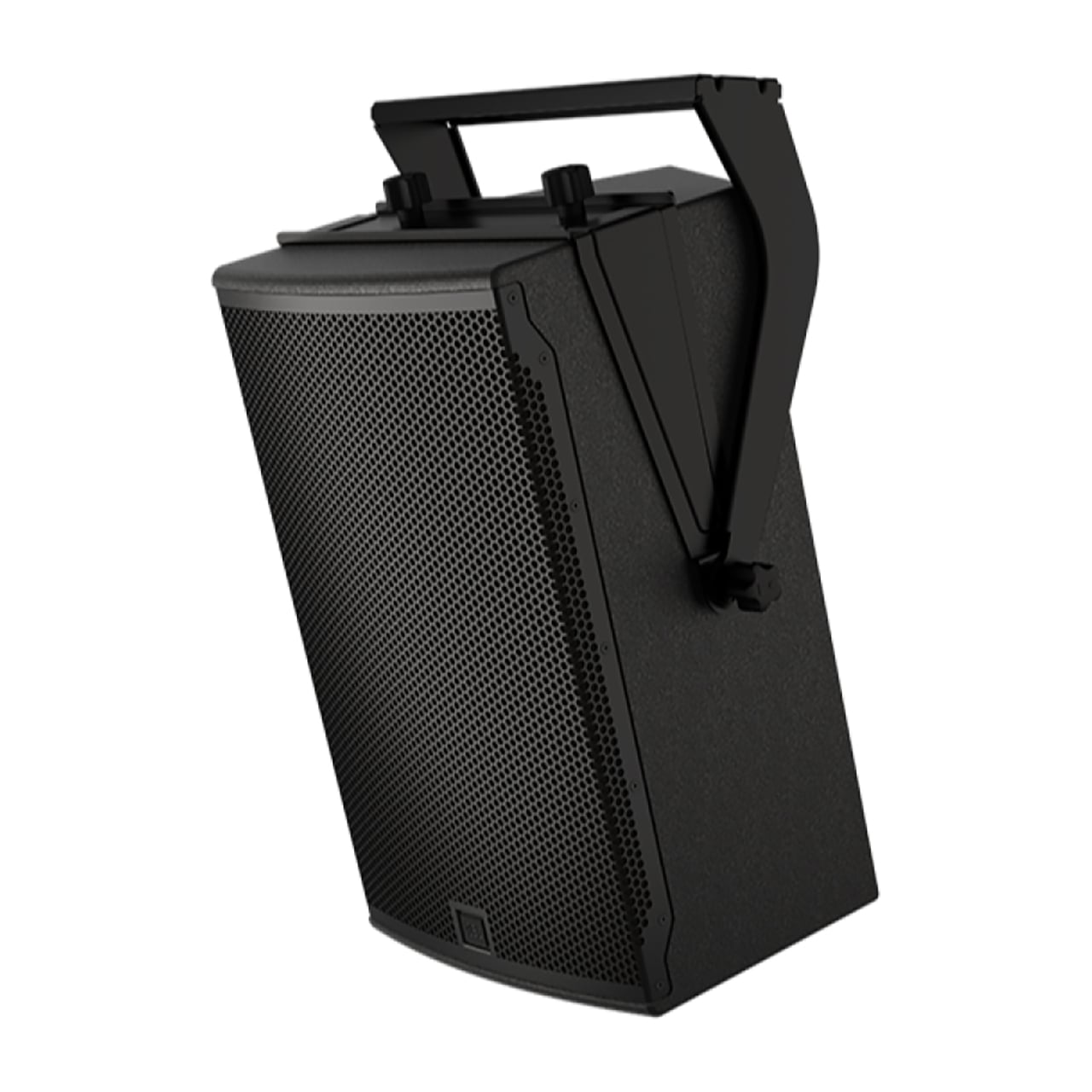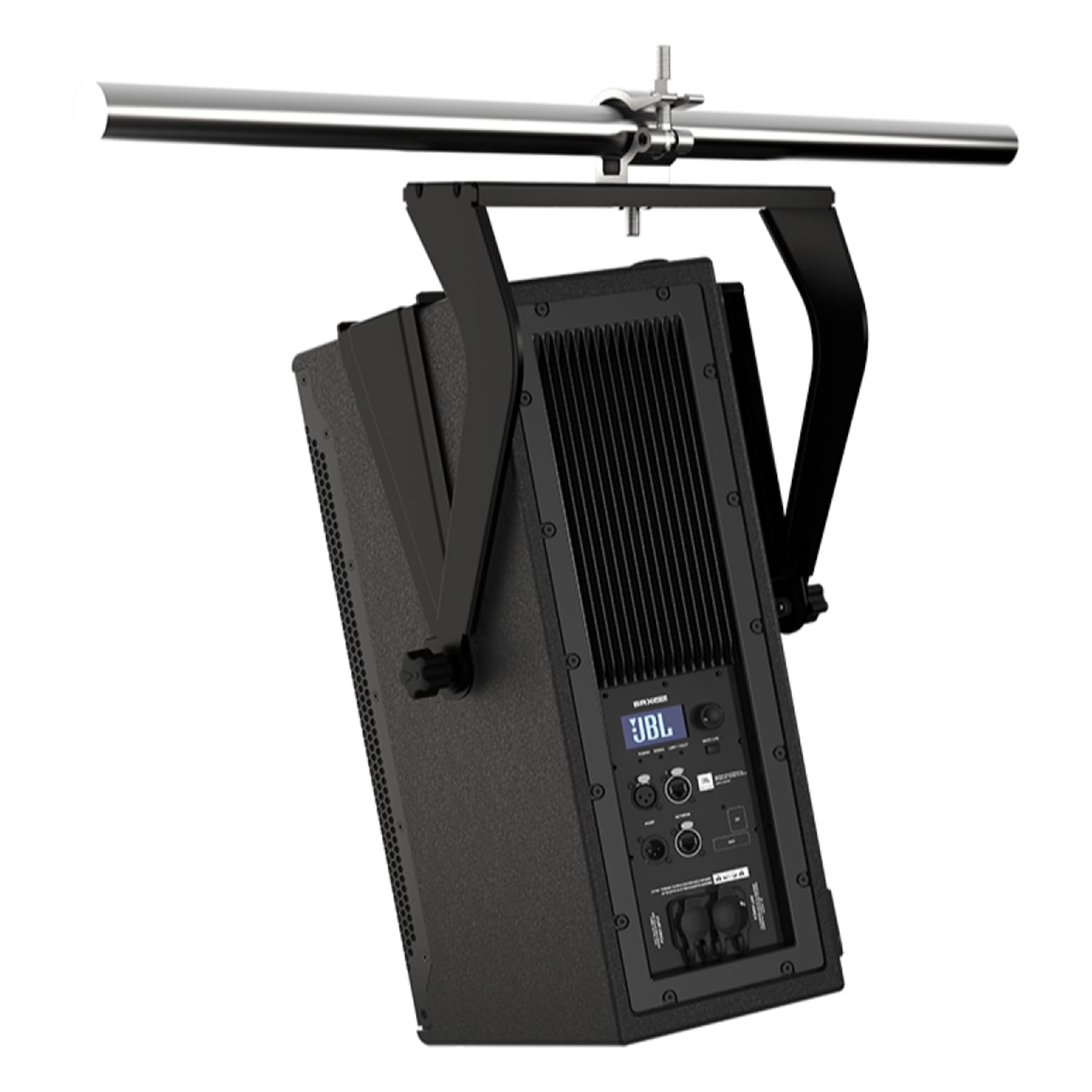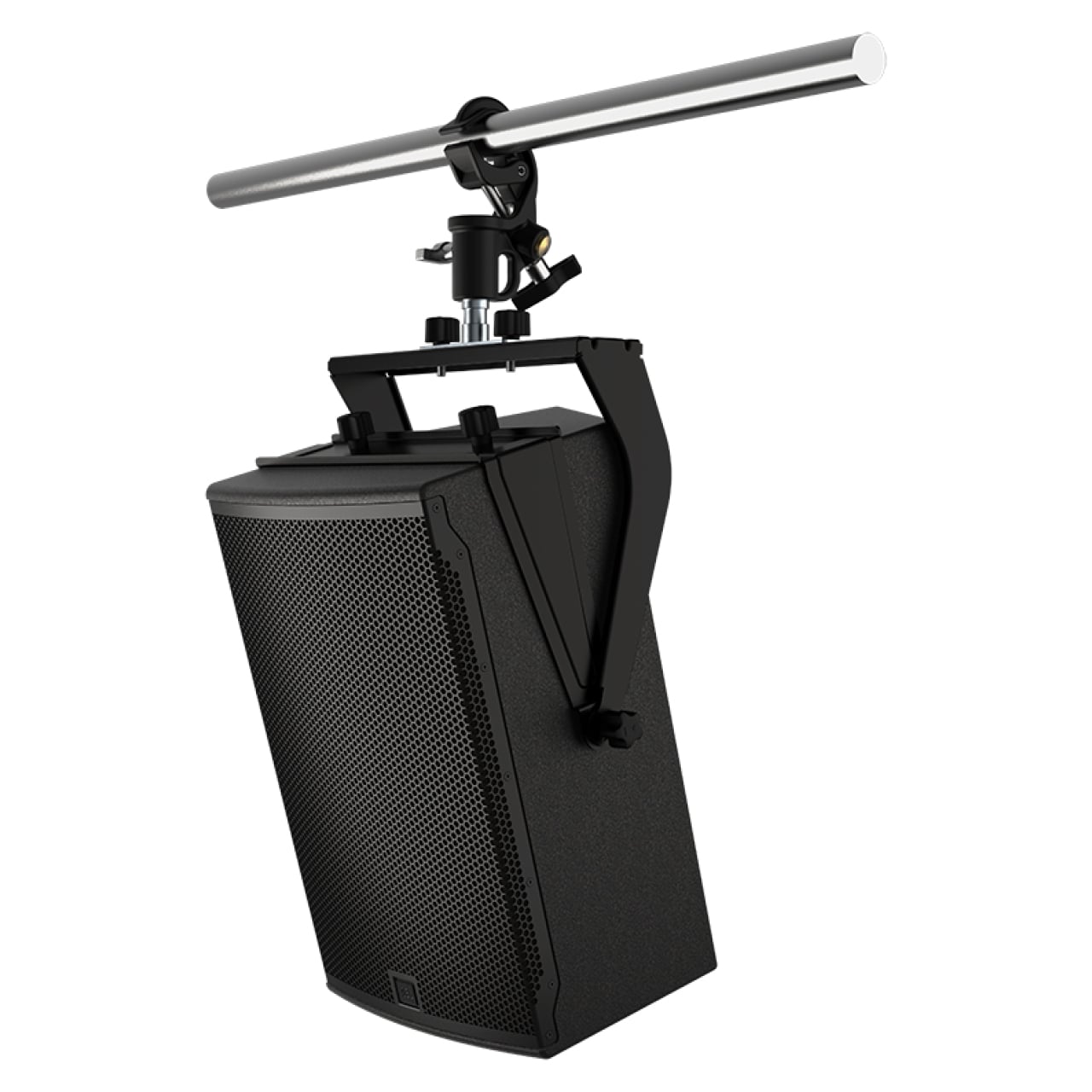 The two-piece design attaches to the enclosure using the included M10 knobs and the two top or bottom M10 QuickLink attachment points on the speaker, depending on the desired orientation. Two additional M10 knobs are used to lock the bracket at the desired tilt angle. Several M12 through-holes are provided for use with standard pipe or truss clamp adapters. The bracket is also compatible with the JBL RC100 rotating clamp which allows for a full 360° horizontal rotation when combined with the TV SPIGOT T accessory. Two M10 attachment points are available for installing eye bolts when suspending SRX912M loudspeakers with wire.