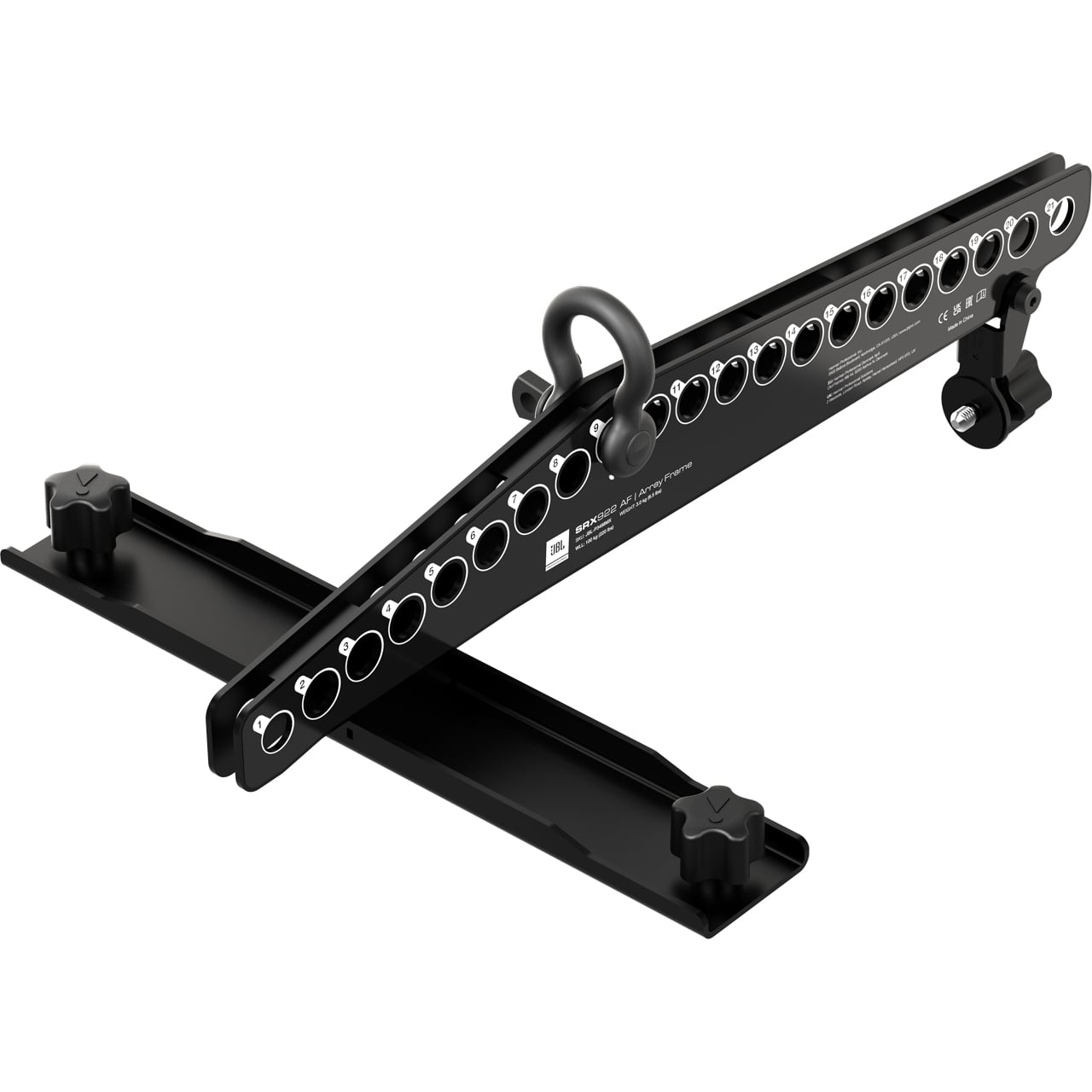 The JBL SRX922 AF is a lightweight, compact array frame designed for suspending SRX922 cabinets. It supports both single-point and dual-point suspension configurations and connects to the SRX922 cabinet using the top and rear-top M10 QuickLink attachment points. Multiple shackle mounting positions are provided on the top of the array frame for single-point suspension. The holes are sized for 0.6" (12mm) shackles and allow for a wide range of tilt angles without the need for a secondary attachment point. In applications requiring extreme down angles, a secondary suspension point can be attached to the bottom rear M10 QuickLink attachment point for dual-point (front-to-back) configurations using the EBK4 M10-20 eyebolt kit. The array frame is also compatible with the JBL Professional RC500 Rotating Clamp, allowing secure attachment to standard truss or pipe structures.