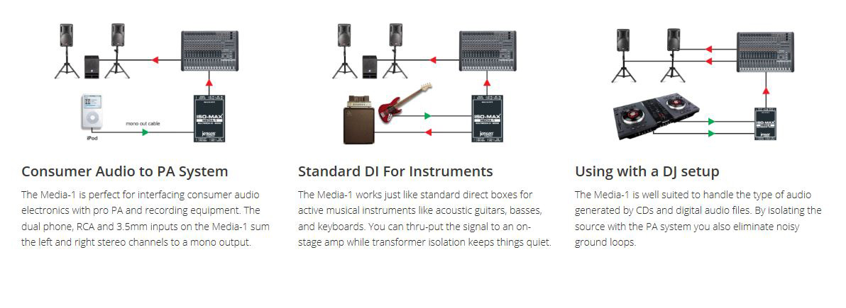 The Iso-Max Media-1 is a multi-purpose direct box designed to interface all types of unbalanced sources to the PA system while enabling signals to be driven distances to 100 meters (300') or more without high frequency loss or introducing noise into the signal path.