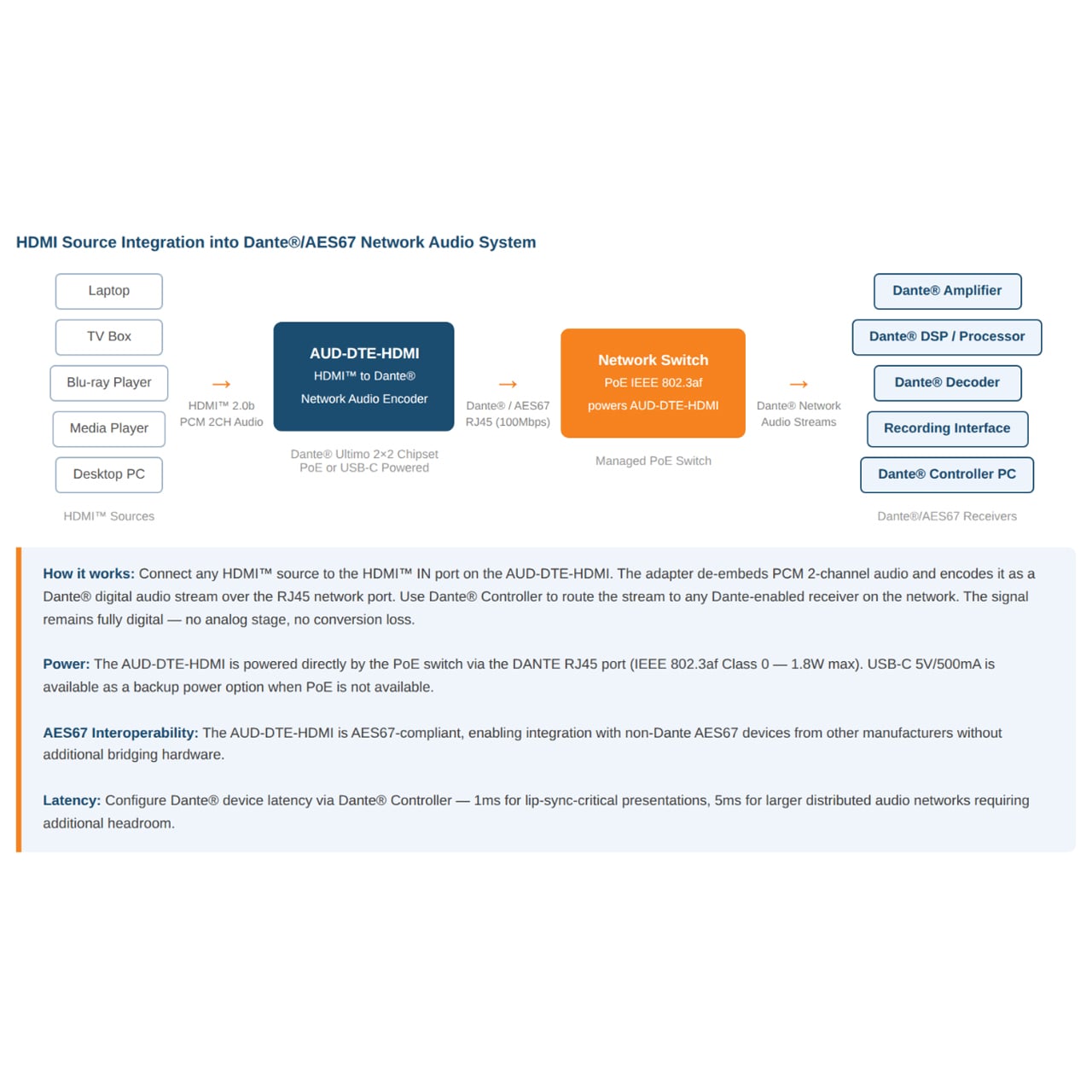 Built on the Dante Ultimo 2x2 chipset, it accepts any HDMI 2.0b source at up to 192kHz/24-bit and delivers Dante output at 44.1/48/88.2/96kHz with configurable 1/2/5ms latency and full AES67 interoperability. Powered by PoE (802.3af Class 0) or USB-C, it installs anywhere without dedicated power infrastructure.