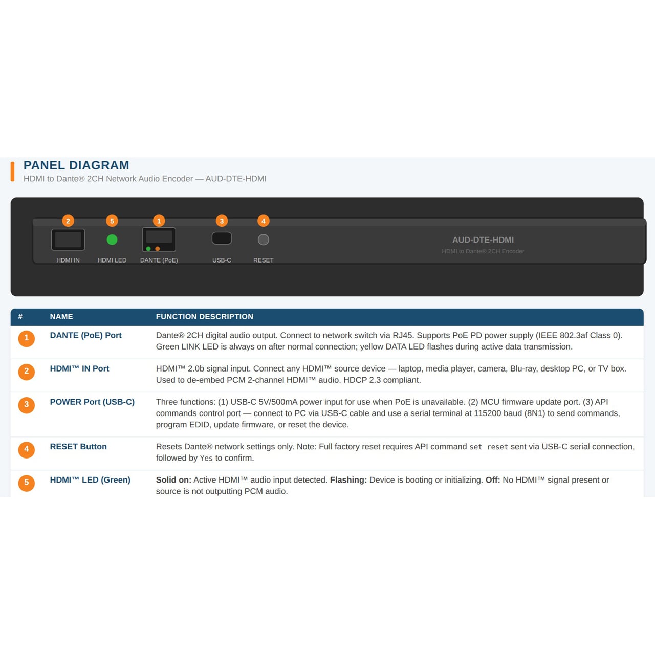 The KanexPro AUD-DTE-HDMI converts HDMI-embedded audio directly into Dante 2-channel digital audio in a single compact adapter - keeping the signal fully digital from HDMI source to Dante destination with no analog stage and no conversion loss.