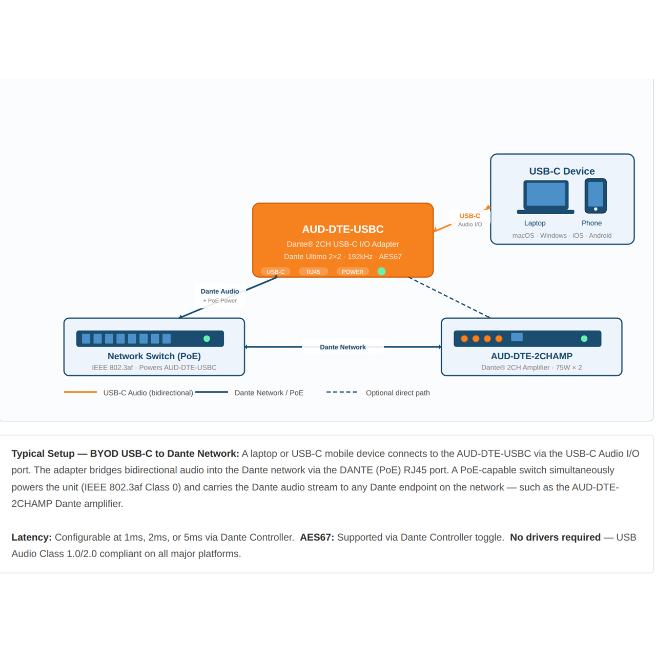 Built on the Dante Ultimo 2x2 engine, the KanexPro AUD-DTE-USBC 2-channel USB audio from laptops, smartphones, and tablets into full-resolution Dante network audio at sampling rates up to 96kHz/24-bit, while simultaneously accepting USB audio output at up to 192kHz/24-bit. A single RJ45 connection to a PoE-capable switch delivers both the Dante network stream and device power over the same cable - eliminating the need for a separate power supply in most installations.