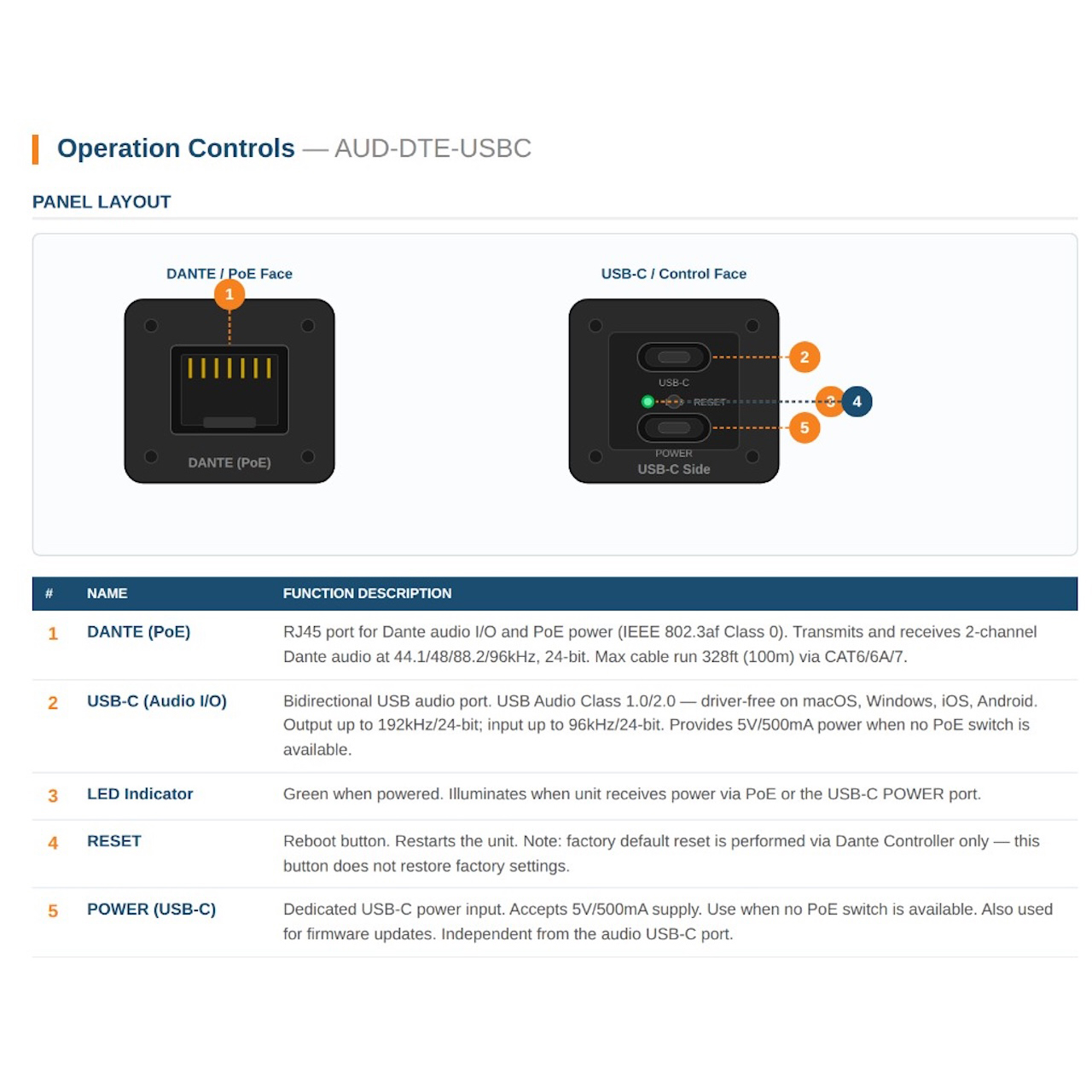 Designed for conference rooms, classrooms, houses of worship, and distributed audio systems, the AUD-DTE-USBC operates as a plug-and-play USB audio class 1.0/2.0 device, recognized natively by macOS, Windows, iOS, and Android. Dante Controller software manages routing, latency (1/2/5ms configurable), and AES67 interoperability - giving integrators full network audio control without touching the host device. The compact plastic enclosure includes integrated hook-and-loop mounting for concealed installation under tables, behind displays, or inside equipment enclosures.