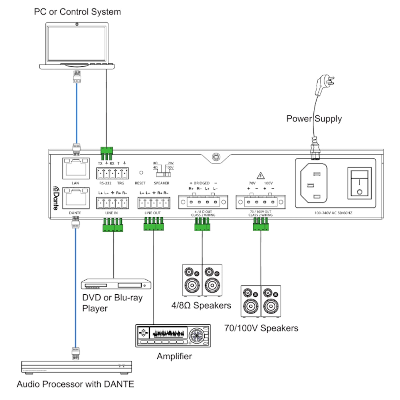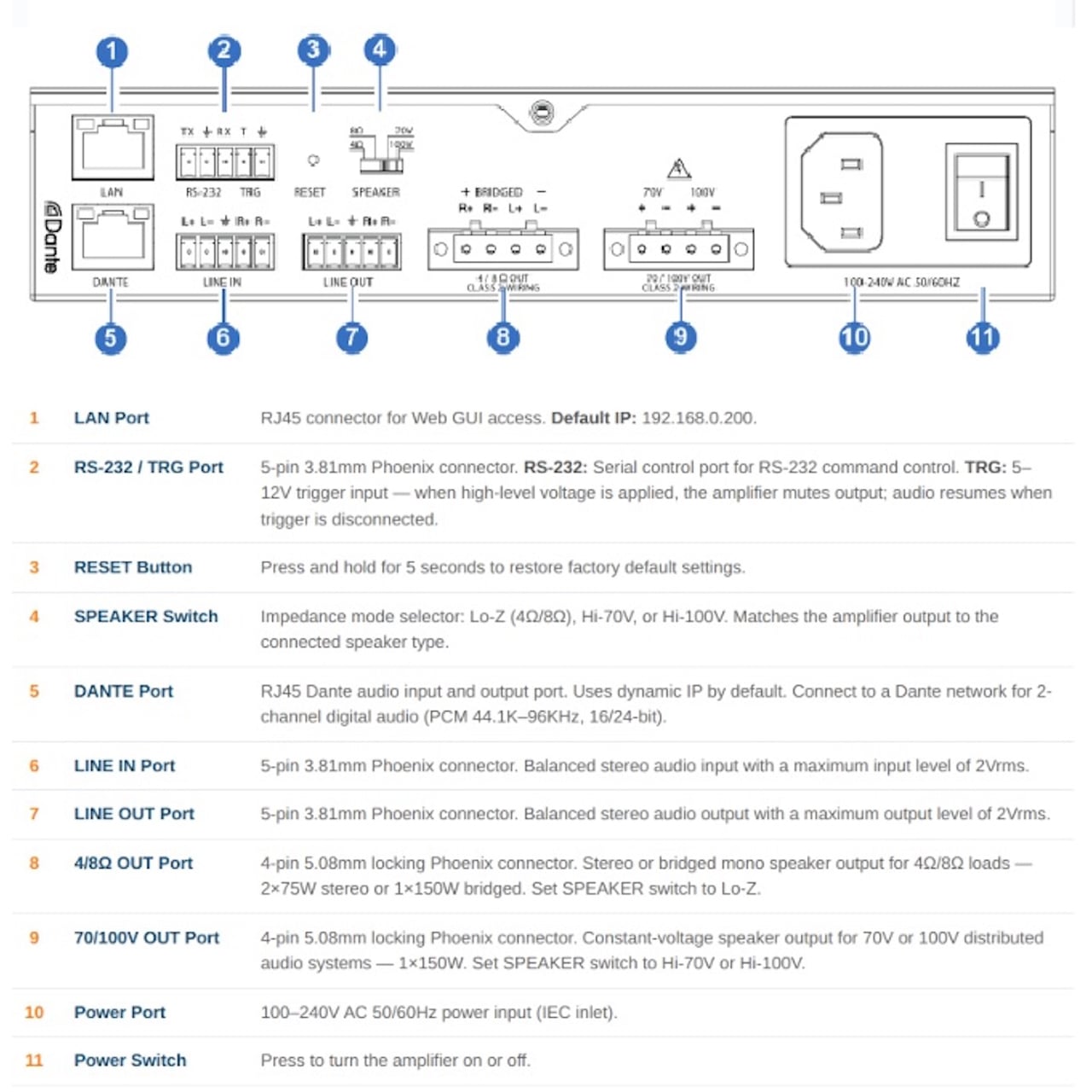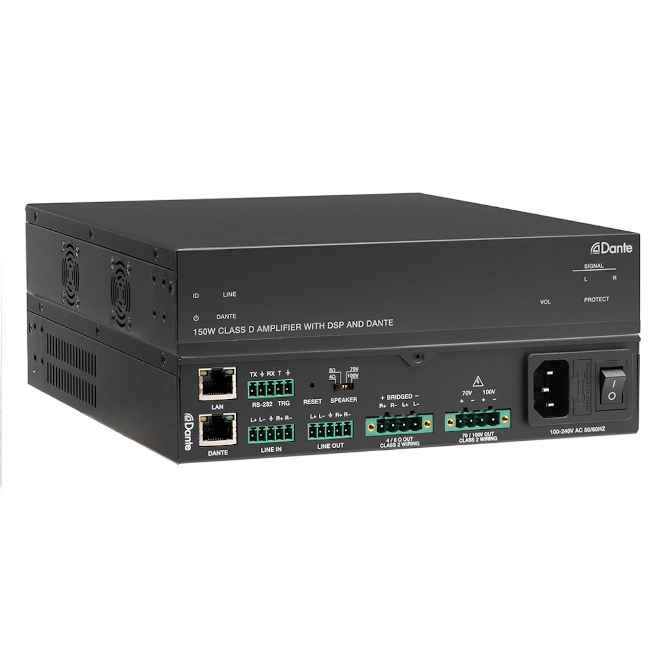Built-in DSP provides 31-band graphic EQ, per-output delay (0ms - 50ms), independent input gain and volume control, and five recallable presets. The amplifier accepts Dante PCM 2-channel audio at up to 96KHz/24-bit alongside balanced stereo line input. A rear-panel speaker impedance switch selects Lo-Z stereo (2x 75W @ 4Ω/8Ω), bridged mono (1x 150W @ 8Ω), or Hi-Z constant voltage (1x 150W @ 70V/100V). Control via RS-232, LAN, and Web GUI. 5-12V trigger input and auto standby for energy-efficient installations. Half-rack/full-rack mountable.