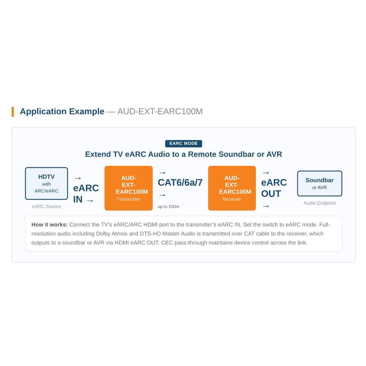 • Hospitality Suites: Deliver eARC audio from in-room TV to centralized AV rack or per-room soundbar up to 328ft (100m) over existing CAT6 infrastructure - no additional audio cabling.