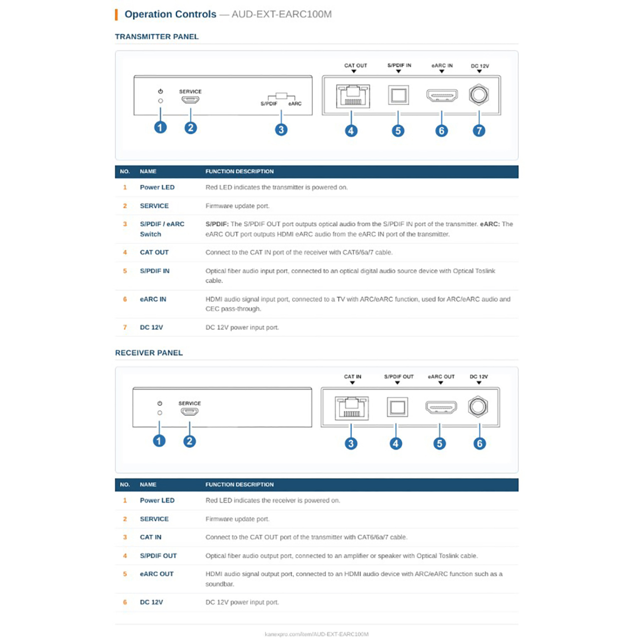 The KanexPro AUD-EXT-EARC100M extends HDMI eARC or S/PDIF audio up to 328ft (100m) over a single CAT cable, delivering lossless surround sound from a TV to a remote soundbar, AVR, or multi-room audio system. The transmitter connects to the TV's eARC/ARC port and sends full-resolution audio - including Dolby Atmos and DTS-HD Master Audio - over standard CAT6/6a/7 cabling to a receiver at the remote audio endpoint.