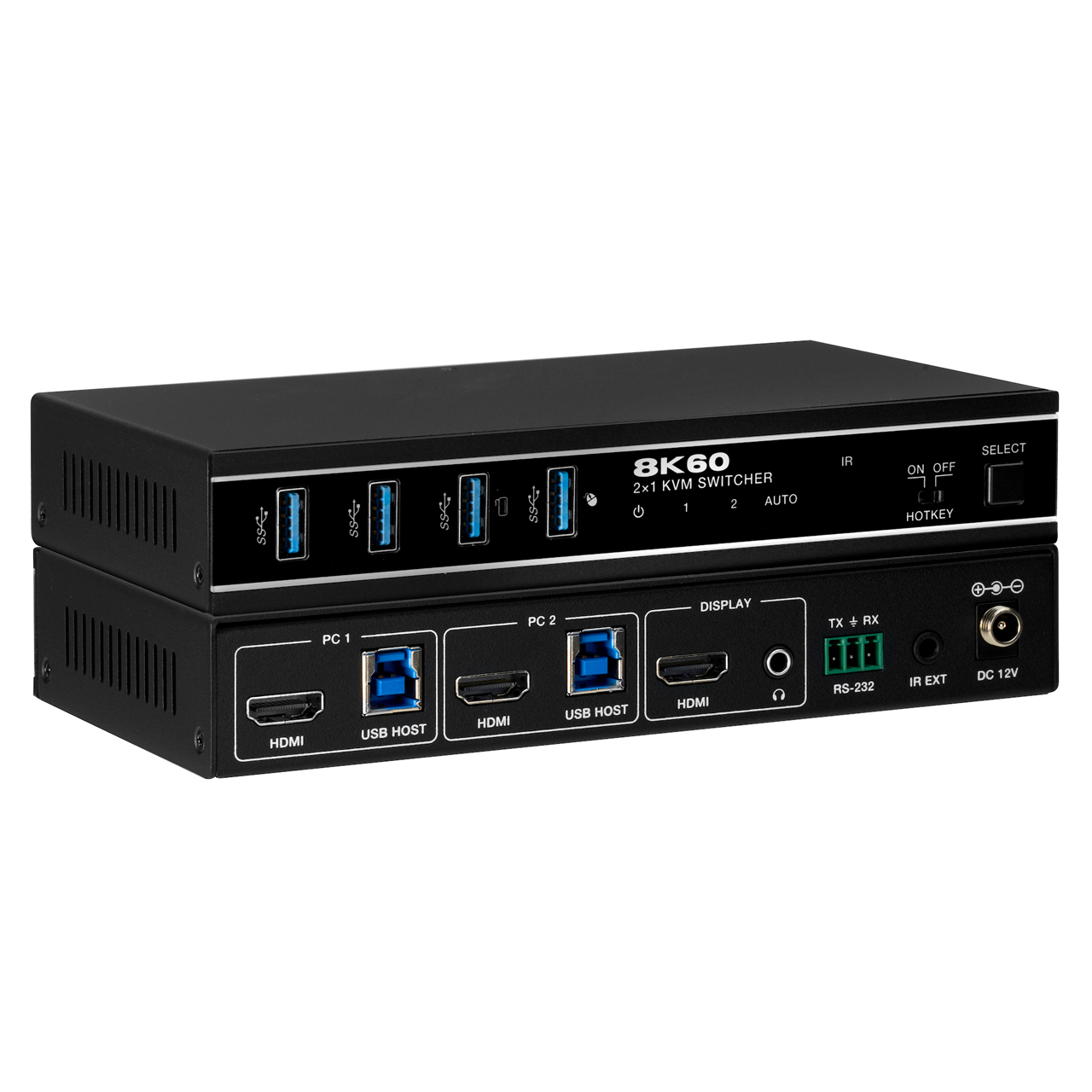 The KanexPro KVM-2X1HDMI8K is a 2x1 KVM Switcher with hotkey switching. It supports resolutions up to 8K@60Hz 4:2:0 10bit and can also transmit USB 3.0 signal up to 5Gbps for KVM function.