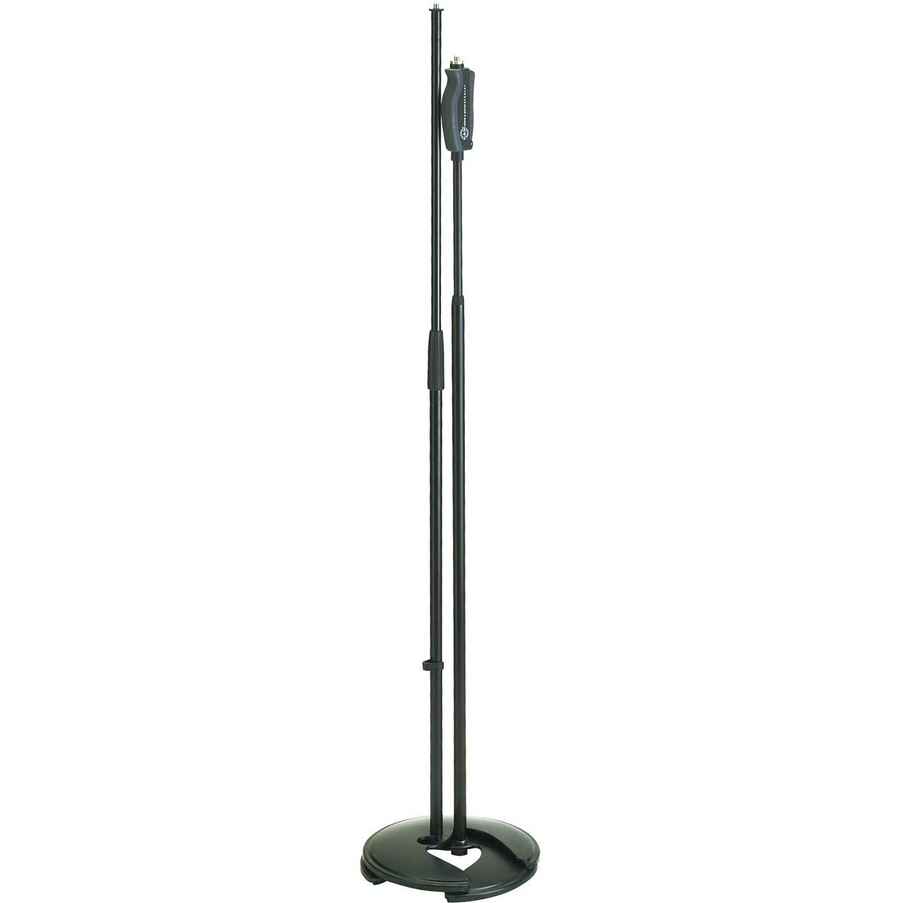 This K&M 26075 model has a round, heavy cast-base with a cut-out design that allows for stacking of up to 5 microphone stands. It has the unique ¯Soft-Touch® one-hand clutch which allows height to be adjusted with a quick squeeze to easily raise and lower the microphone.