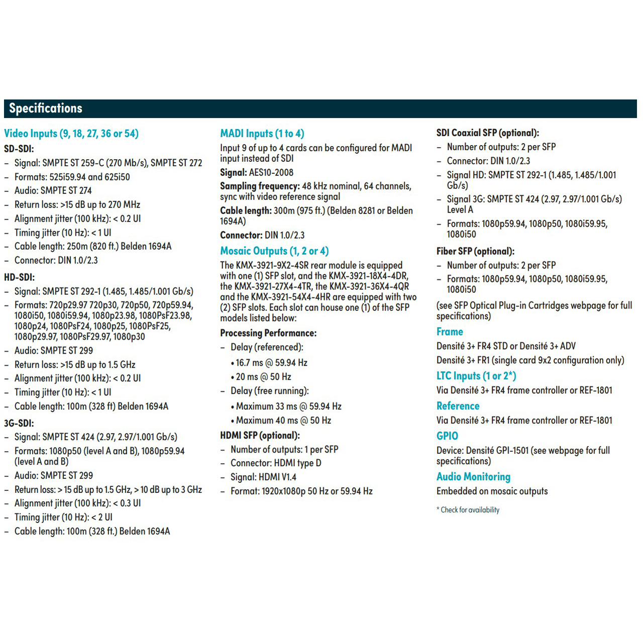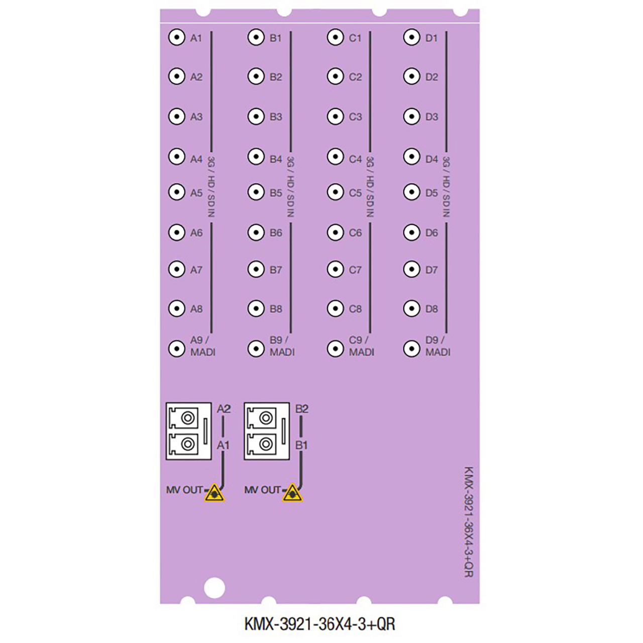 The Grass Valley KMX-3921-36X4-3+QR is a Quadruple rear panel (rear module) with dual SFP slots. Required for expanding four KMX-3921 cards to a 36x1, 36x2 or 36x4 multiviewer to provide up to 36 PIPs over 1, 2, or 4 displays. SDI, HDMI or fiber outputs from the rear panel require SFP selection (optional). Suitable for Densit‚ 3+ FR4 STD or Densit‚ 3+ ADV only.