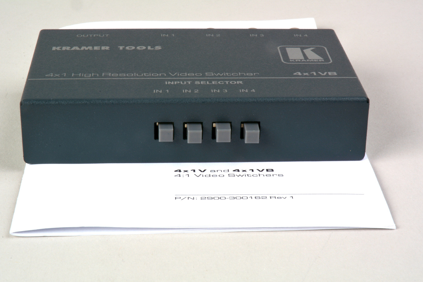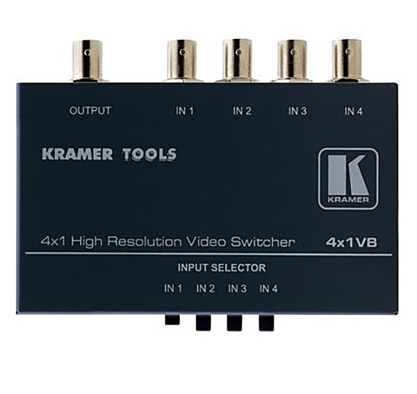 The Kramer 4x1VB is a high-quality 4x1 mechanical switcher designed for composite video signals using BNC connectors. It accepts up to four inputs and let's you select any input to be routed to one output using the buttons located on the front panel. High-quality switching components ensure minimal crosstalk and a high bandwidth of 400MHz (-3dB).