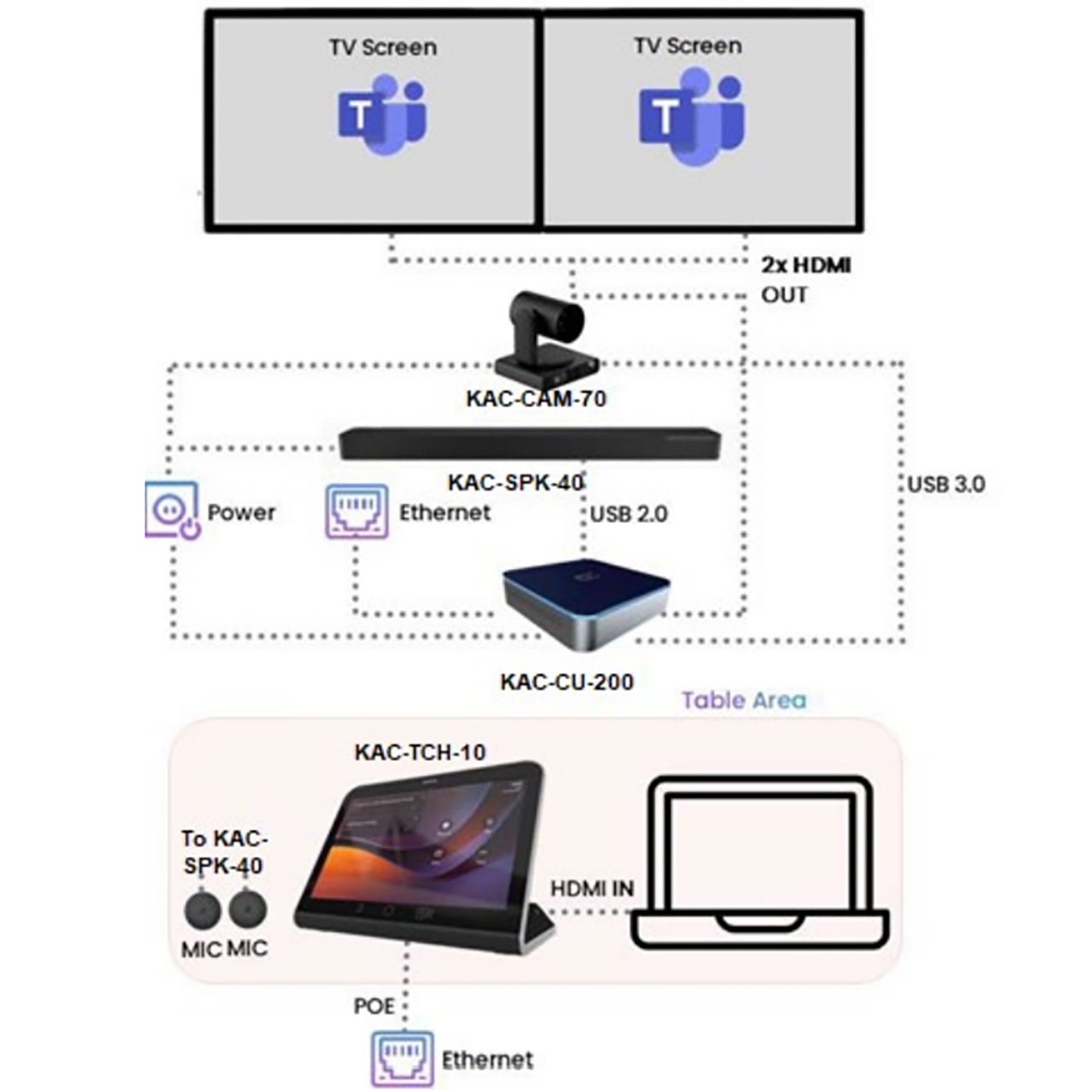 What sets the KAC-CAM-70 apart is its superior wide-angle sensor, which, when paired with our KAC-CU-200 MTR system, it provides a complete room view alongside a focused PTZ stream. Both video feeds are efficiently managed by the KAC-CU-200, ensuring seamless coverage for an exceptional meeting experience.
