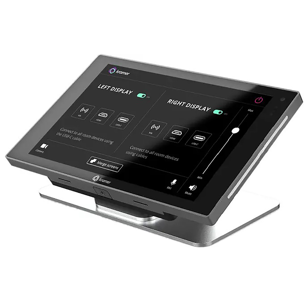 The Kramer KT-208WM is a new powerful, 8-inch, IPS, multi-touch, touch panel with 1280x800 resolution. Elegantly designed for decorative room integration, this portable touch panel can be deployed either on a tabletop or wall. KT-208WM, with the latest Android 11, supports wired PoE (Power over Ethernet) and advanced Wi-Fi connectivity options. The touch panel has a built-in speaker and camera and comes either with a tabletop or a wall mount. The touch panel is easy to assemble, using elegant wiring, secured mounting, reliable operation and flexible deployment. KT-208WM is a touch panel that is ideal for any 24/7 Kramer-supported commercial AV or control application and features a user-friendly, fully customizable graphical user interface configured by Kramer software.