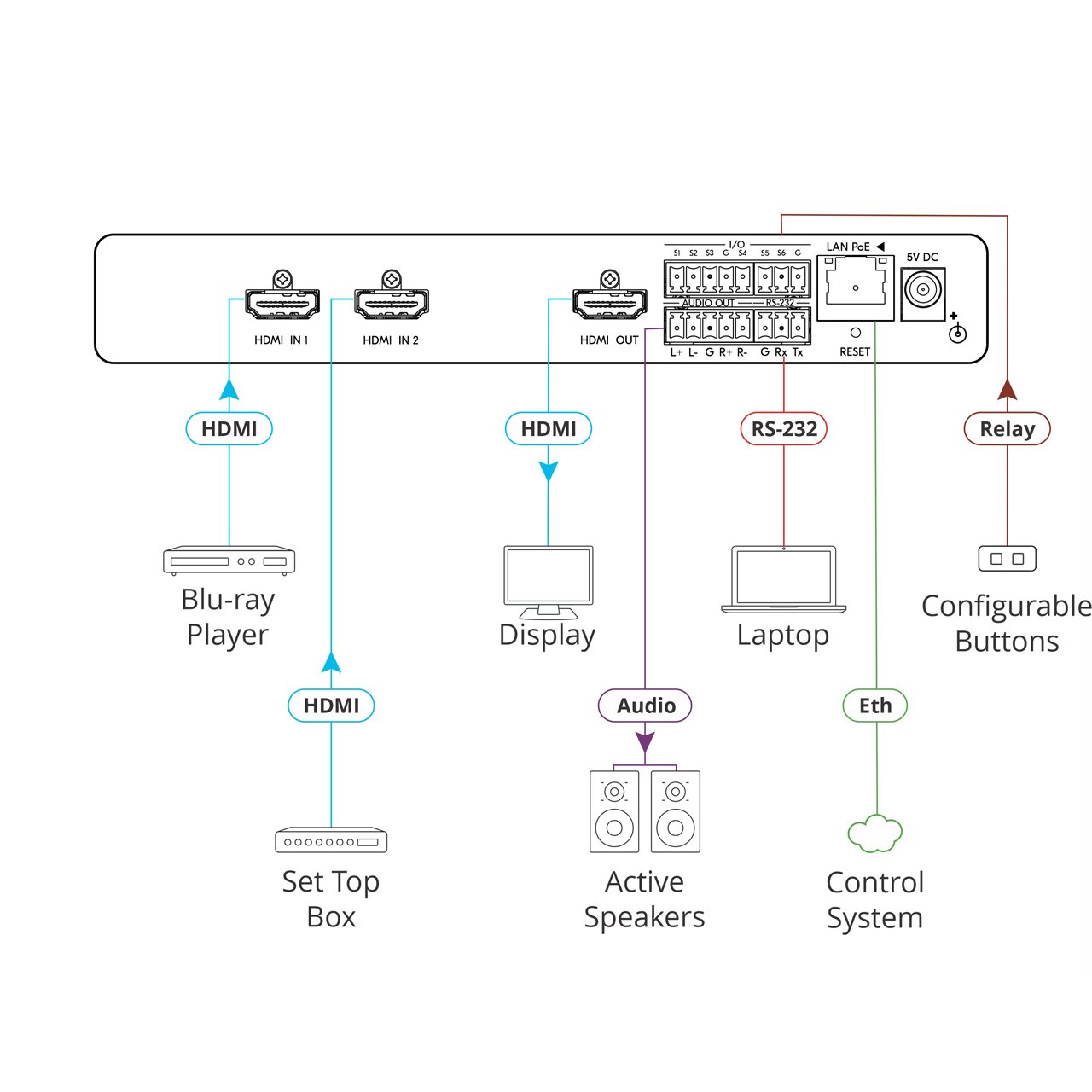 Remote IP-driven intelligent control of connected HDMI and sensor devices via RS-232 or I/O. Eliminating the need for an external control gateway, this feature reduces installation complexity and costs, to enable easy integration with control systems, such as Kramer Control.
