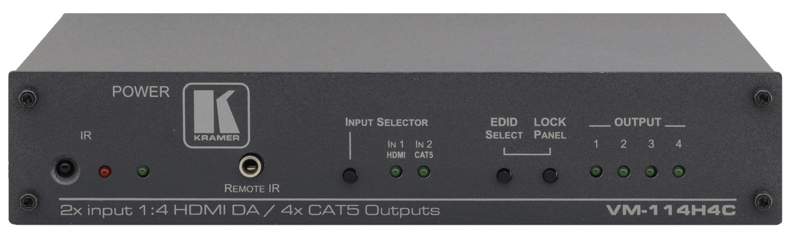 The VM-114H4C is a high-performance switcher and distribution amplifier for HDMI and twisted pair signals. It reclocks and equalizes one of two selectable input signals (HDMI or twisted pair) and distributes it to four twisted pair outputs.