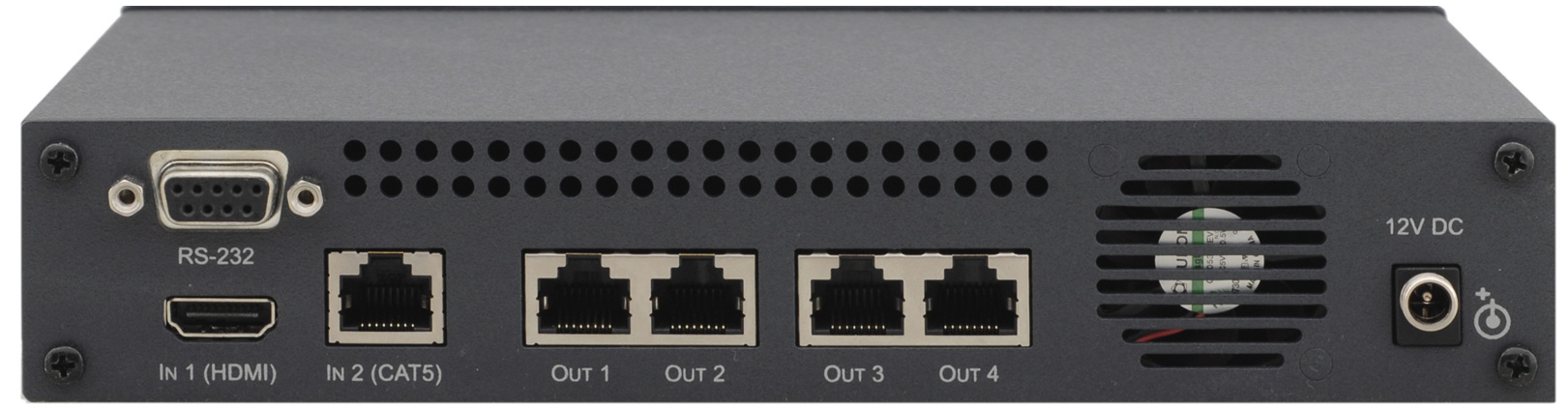 • Indicator LEDs: IR communication, power, IN 1 (HDMI), IN 2 (CAT5), OUTPUT 1, 2, 3 and 4