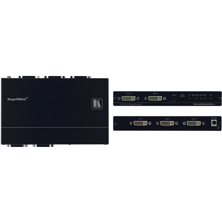 The Kramer VM-400HDCPxl M is a 1:4 distribution amplifier for up to 4K@60Hz (4:2:0) HDMI signals, complying with HDCP 1.4 content protection standard, via single-link DVI-I connections. The unit takes one DVI input, equalizes and reclocks the signal, and distributes it to four identical outputs.